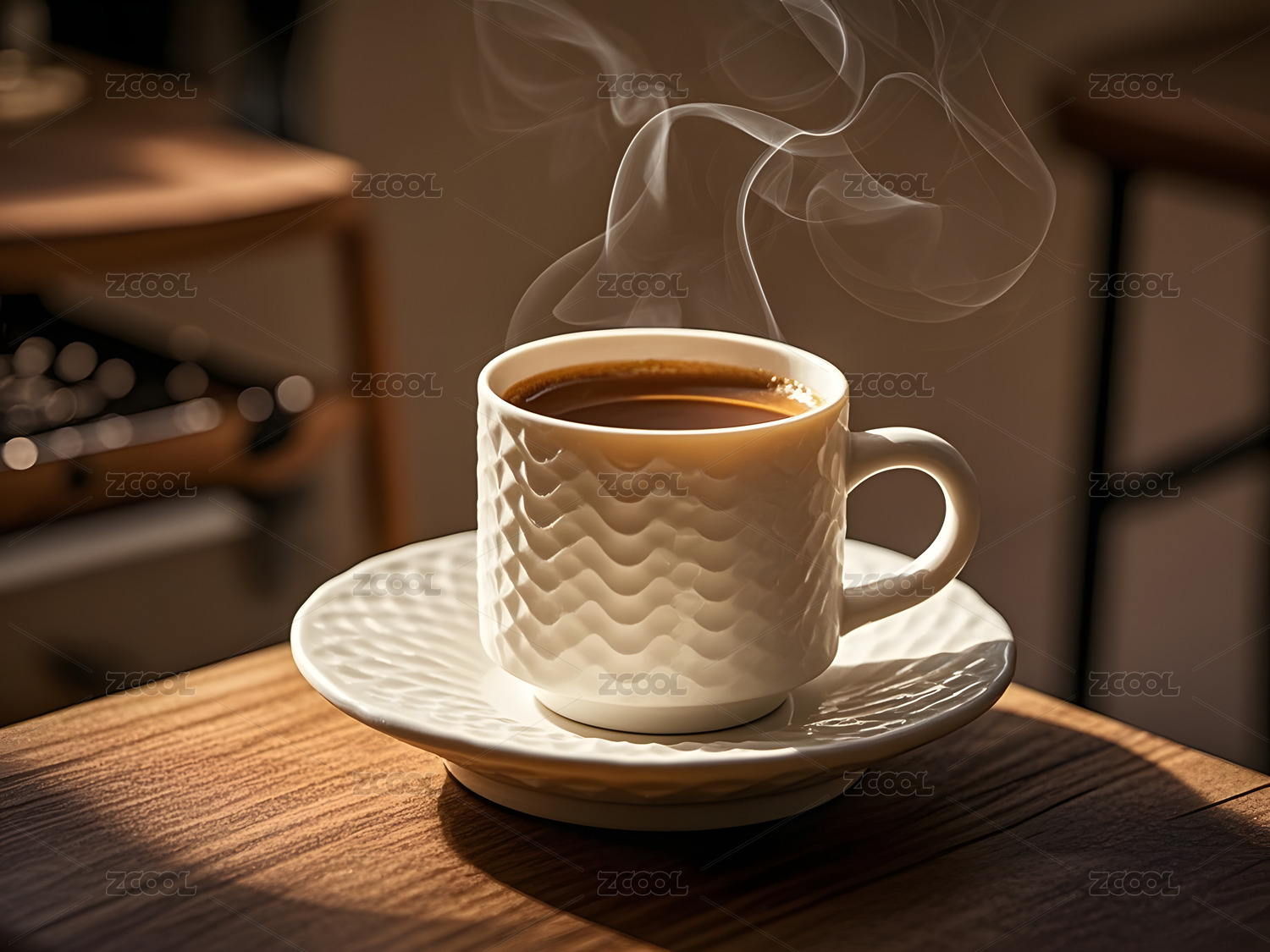 咖啡厅桌面上冒热气的一杯咖啡