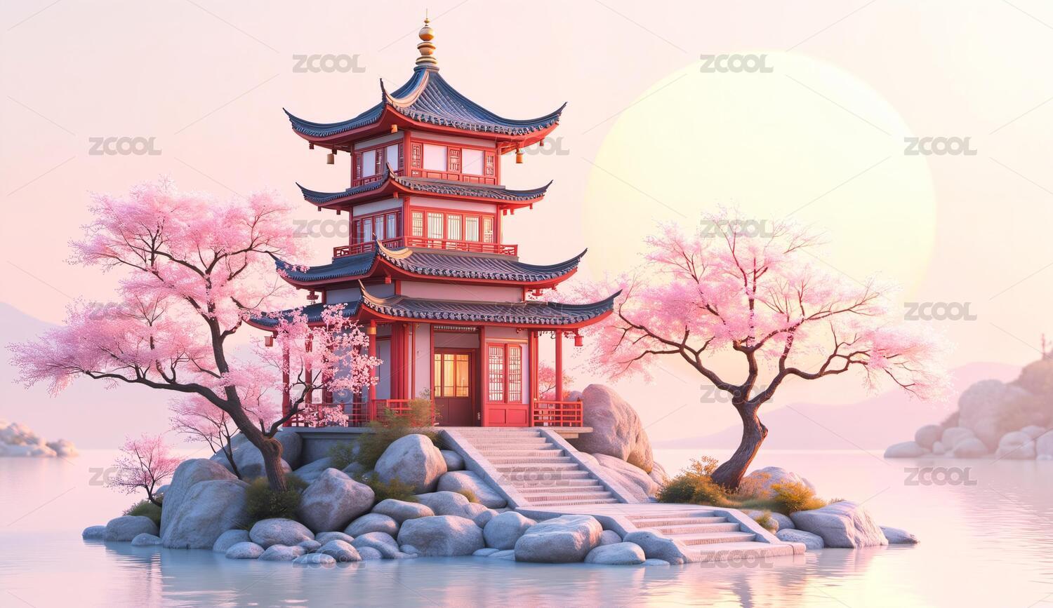 中式亭台与粉色樱花宁静湖景