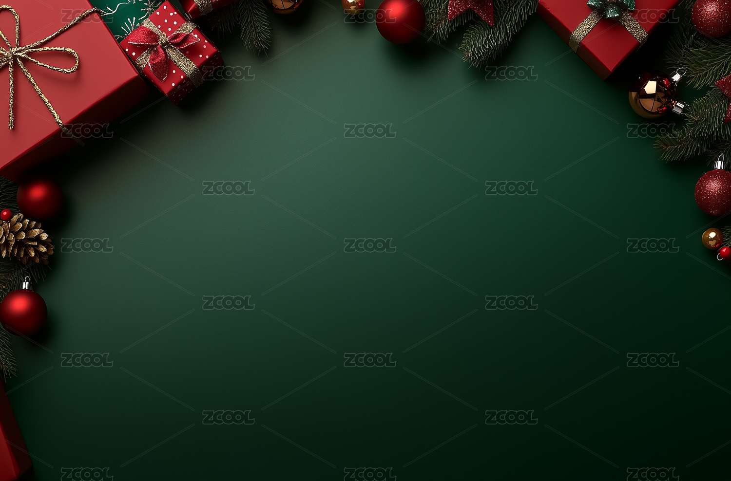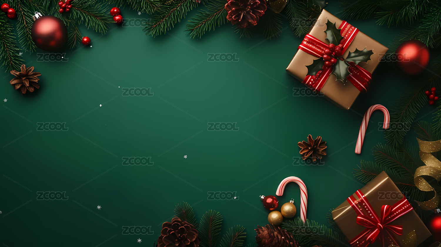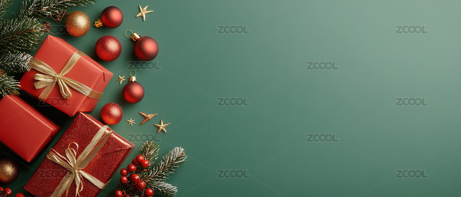 圣诞装饰与礼物盒的绿色背景