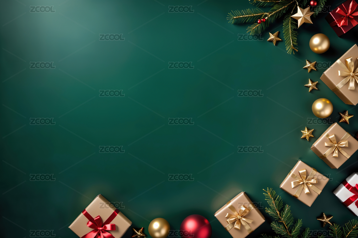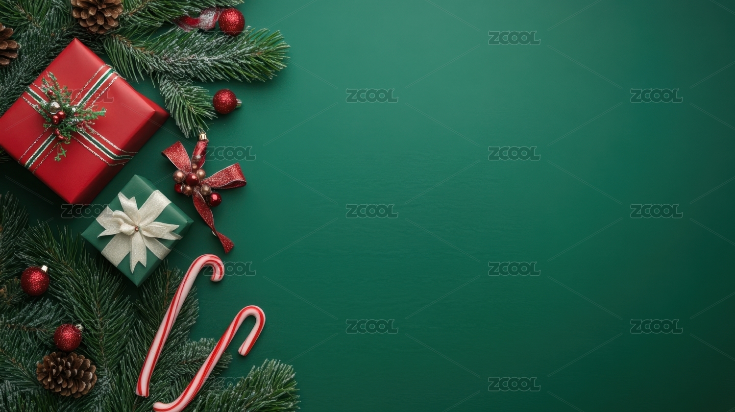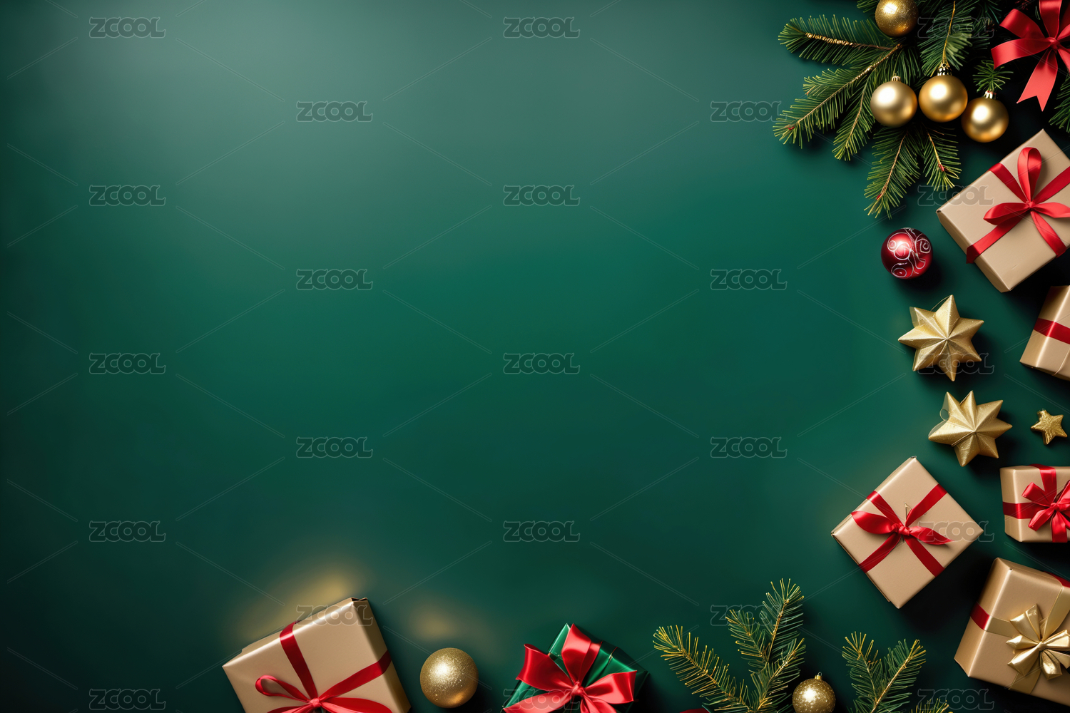 圣诞装饰与礼物盒的绿色背景