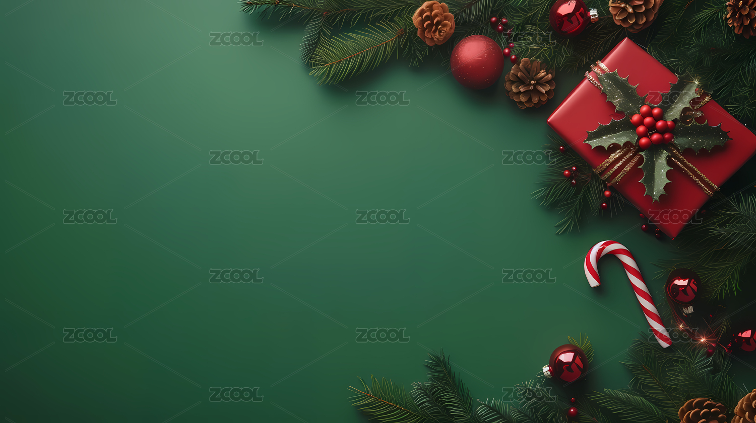 正上方绿色背景上的圣诞装饰照片
