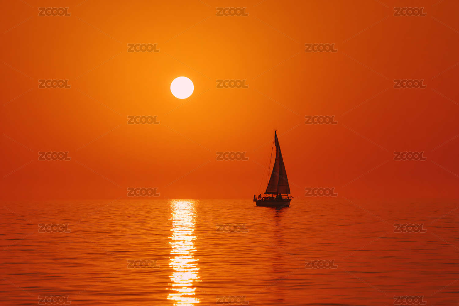 中国广西涠洲岛橘子海日落与夕阳下的渔船