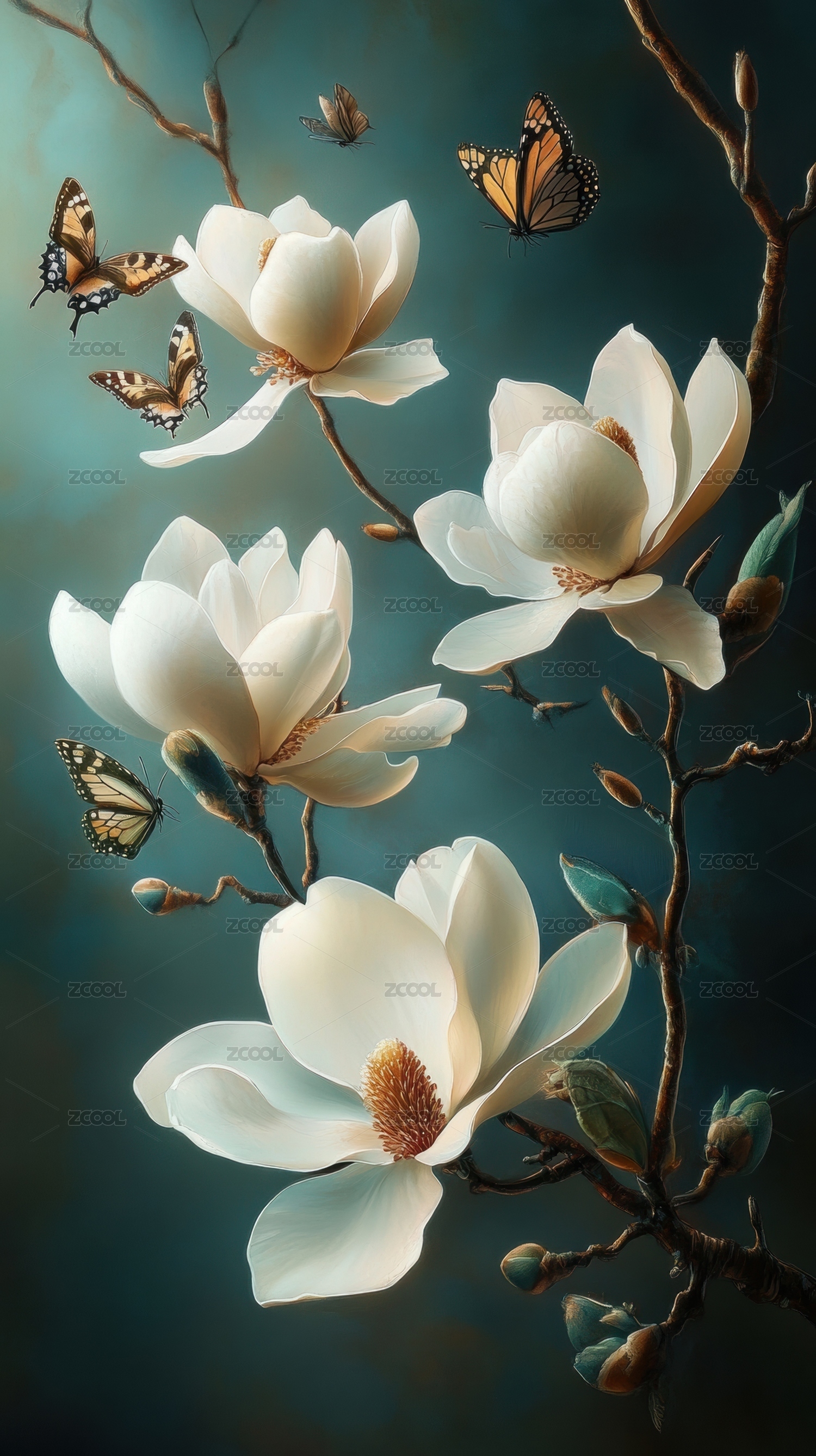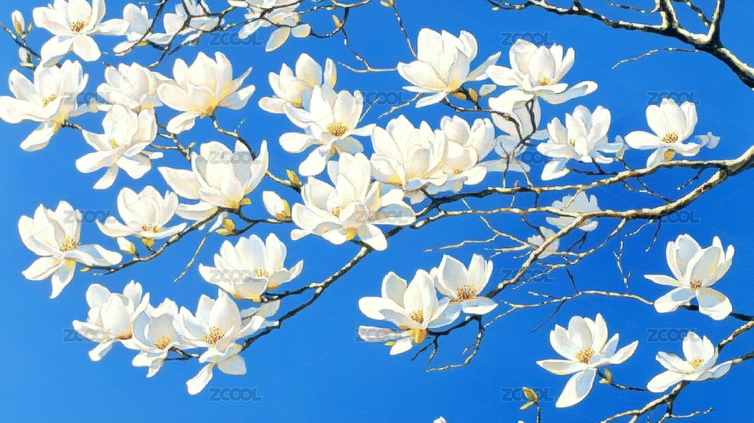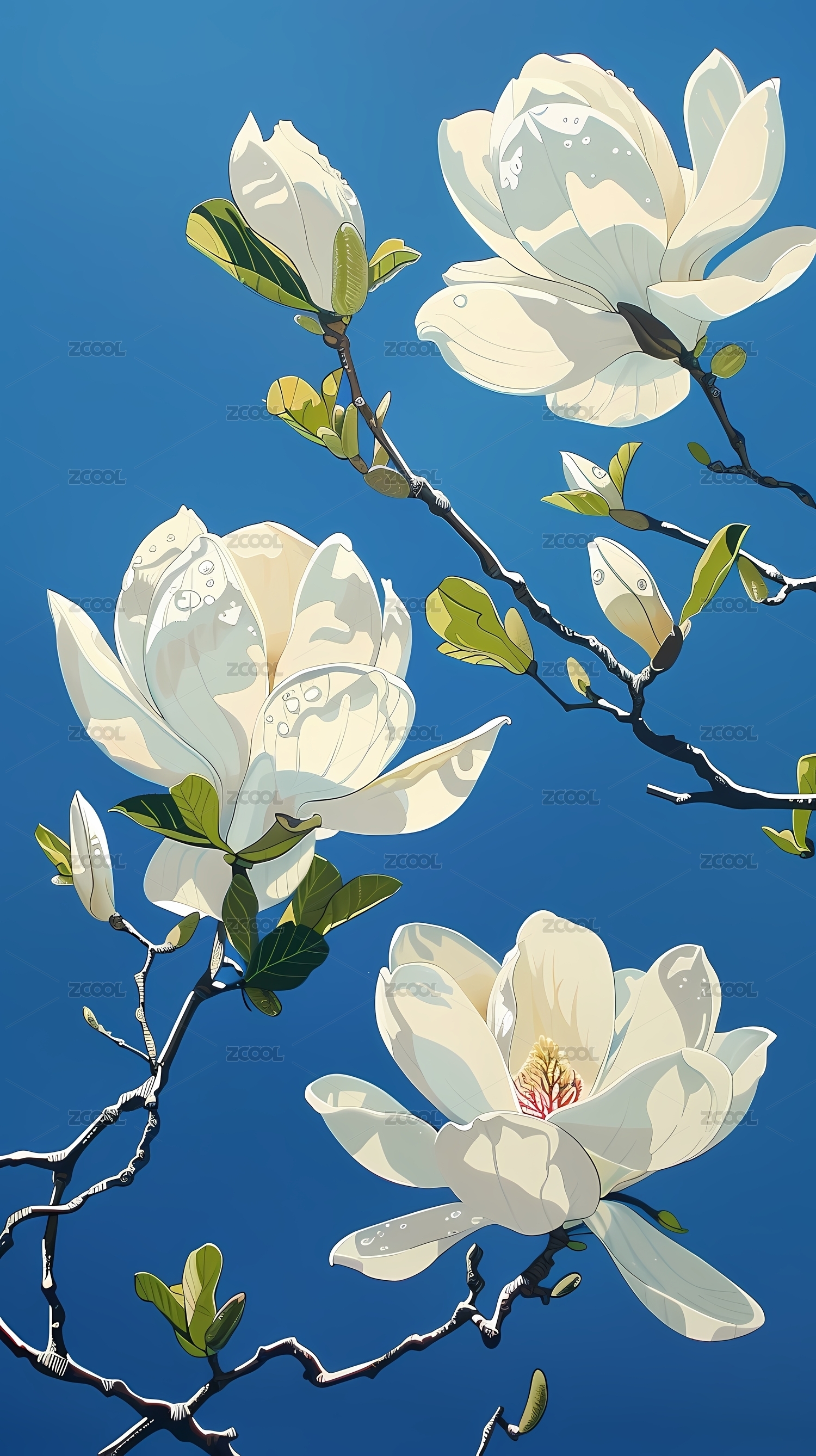 玉兰花,玉兰,白色,花束,蓝色,天空,树叶,卡通,水彩,油画