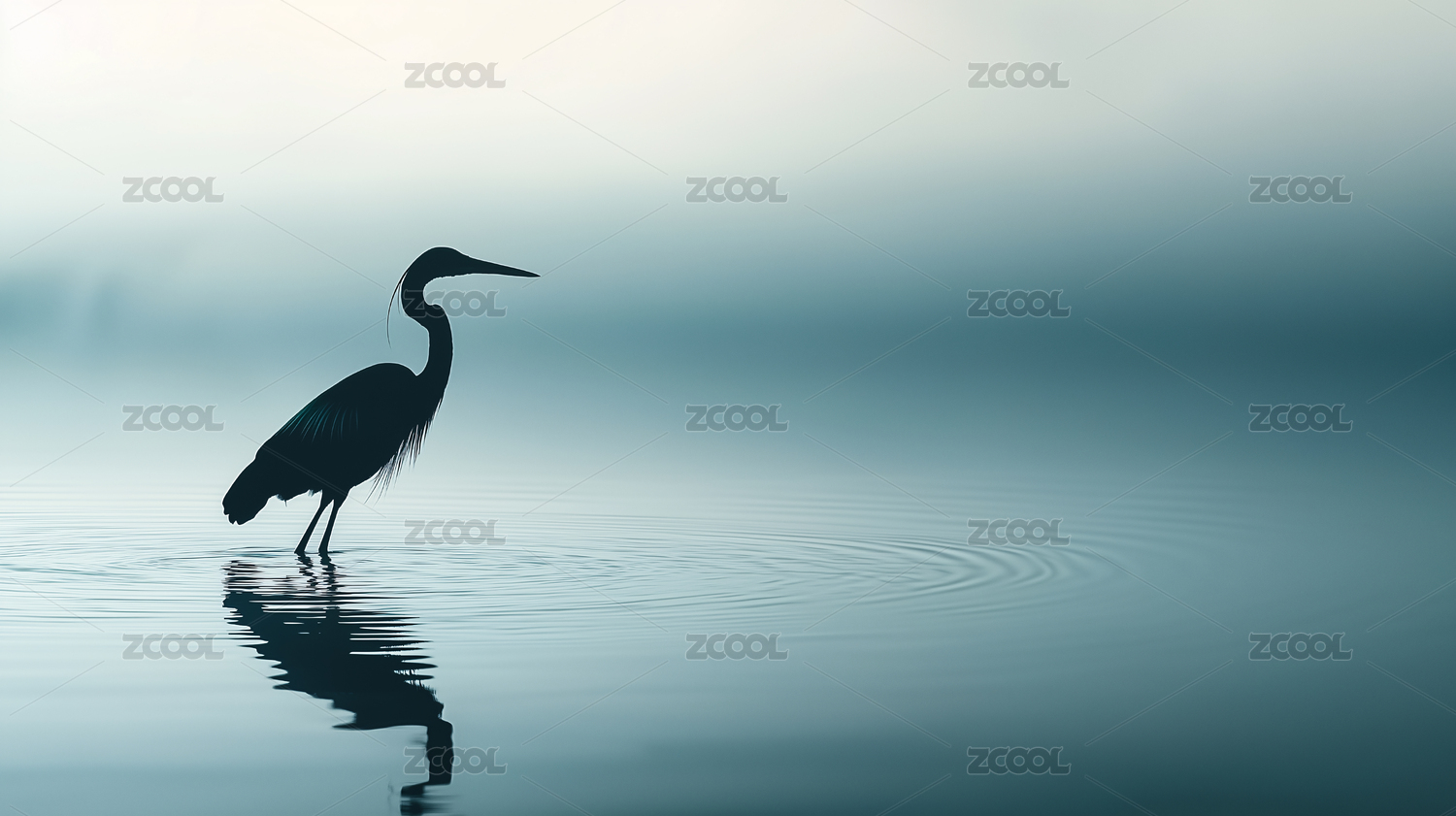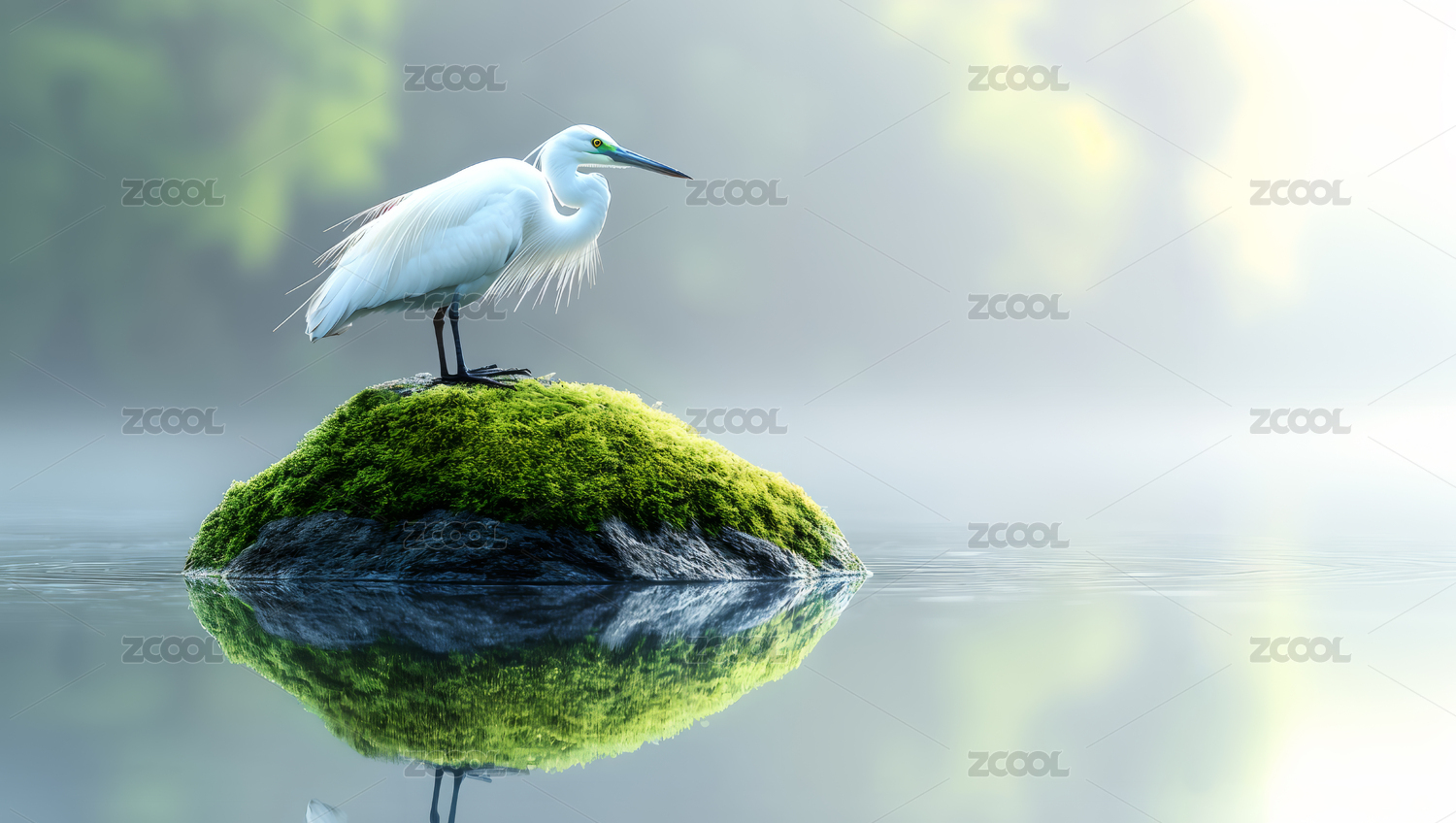 晨雾中鹭鸟静立湖畔