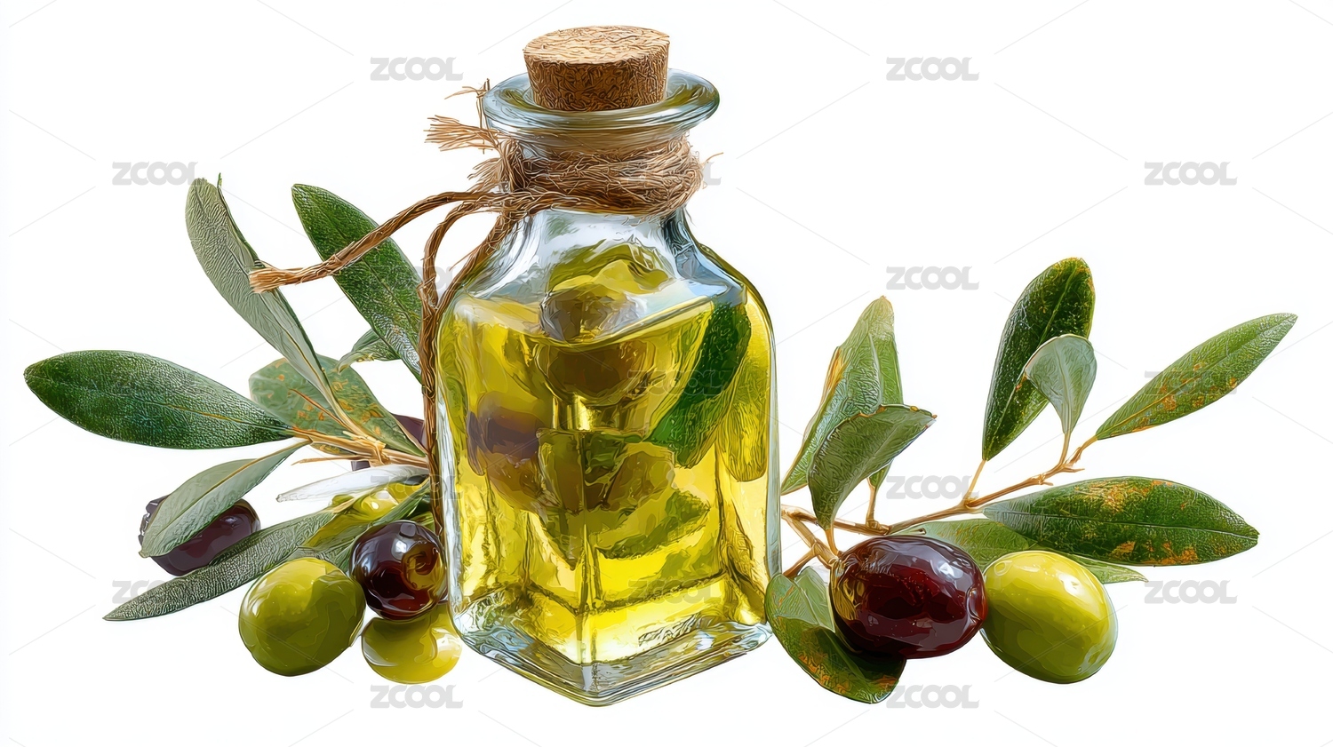 橄榄油,玻璃瓶,软木塞,麻绳,橄榄,枝叶,麻布,液体,色泽,金黄
