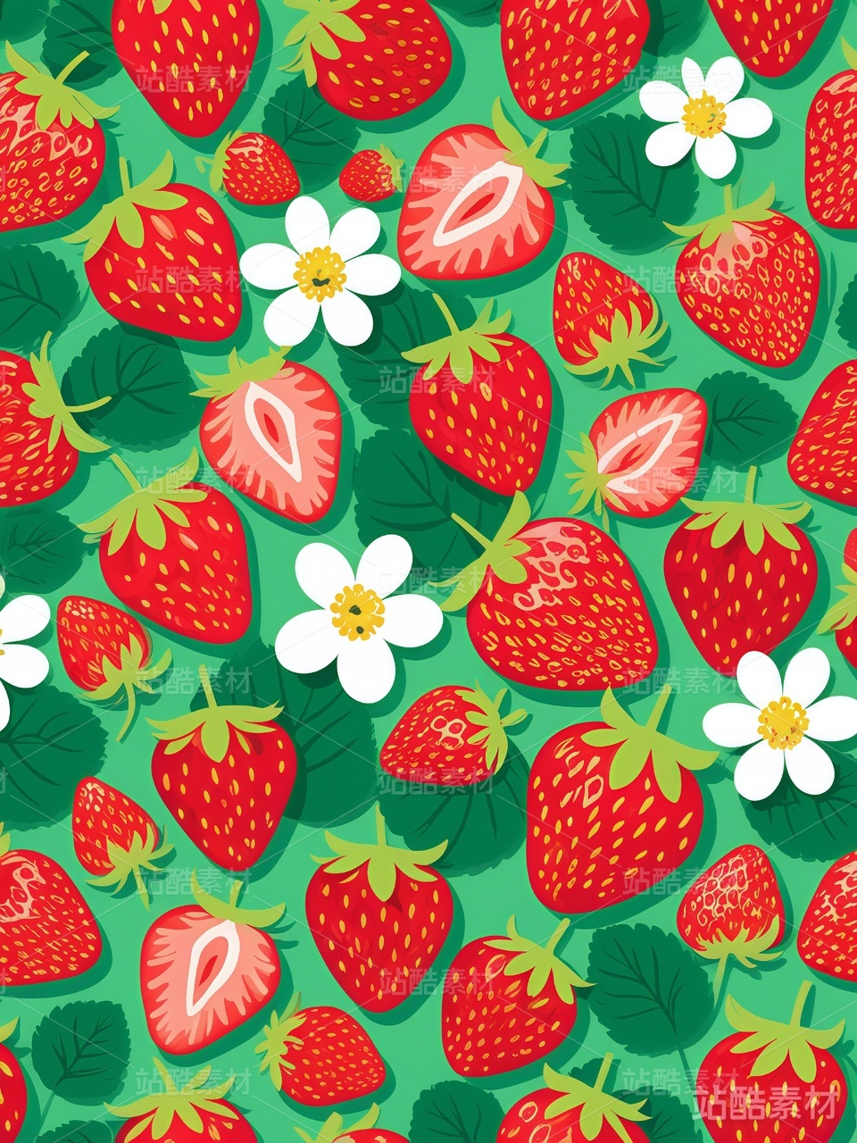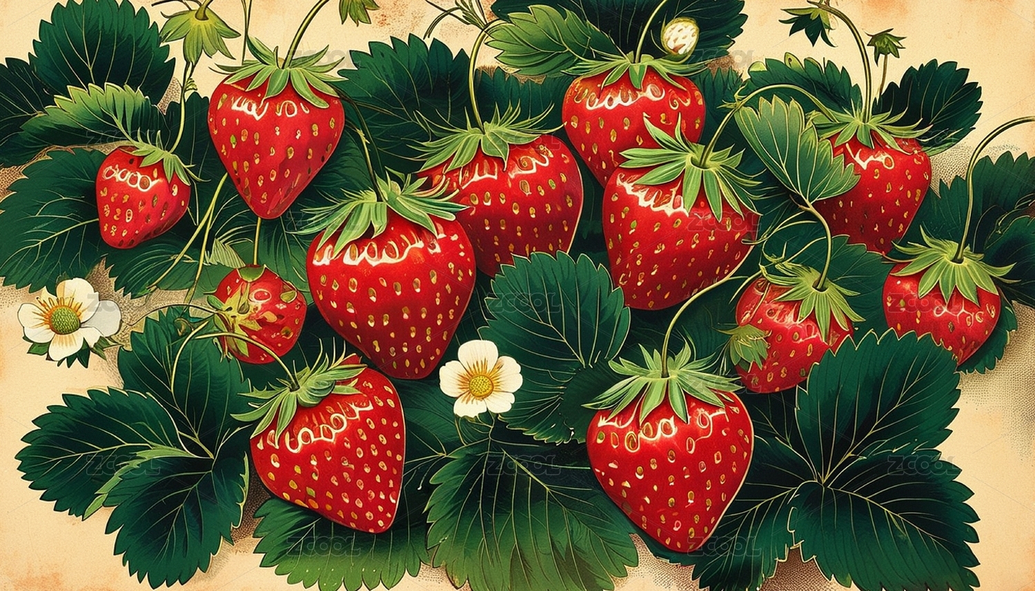 白底手绘草莓插图,茎上长出绿叶和花朵