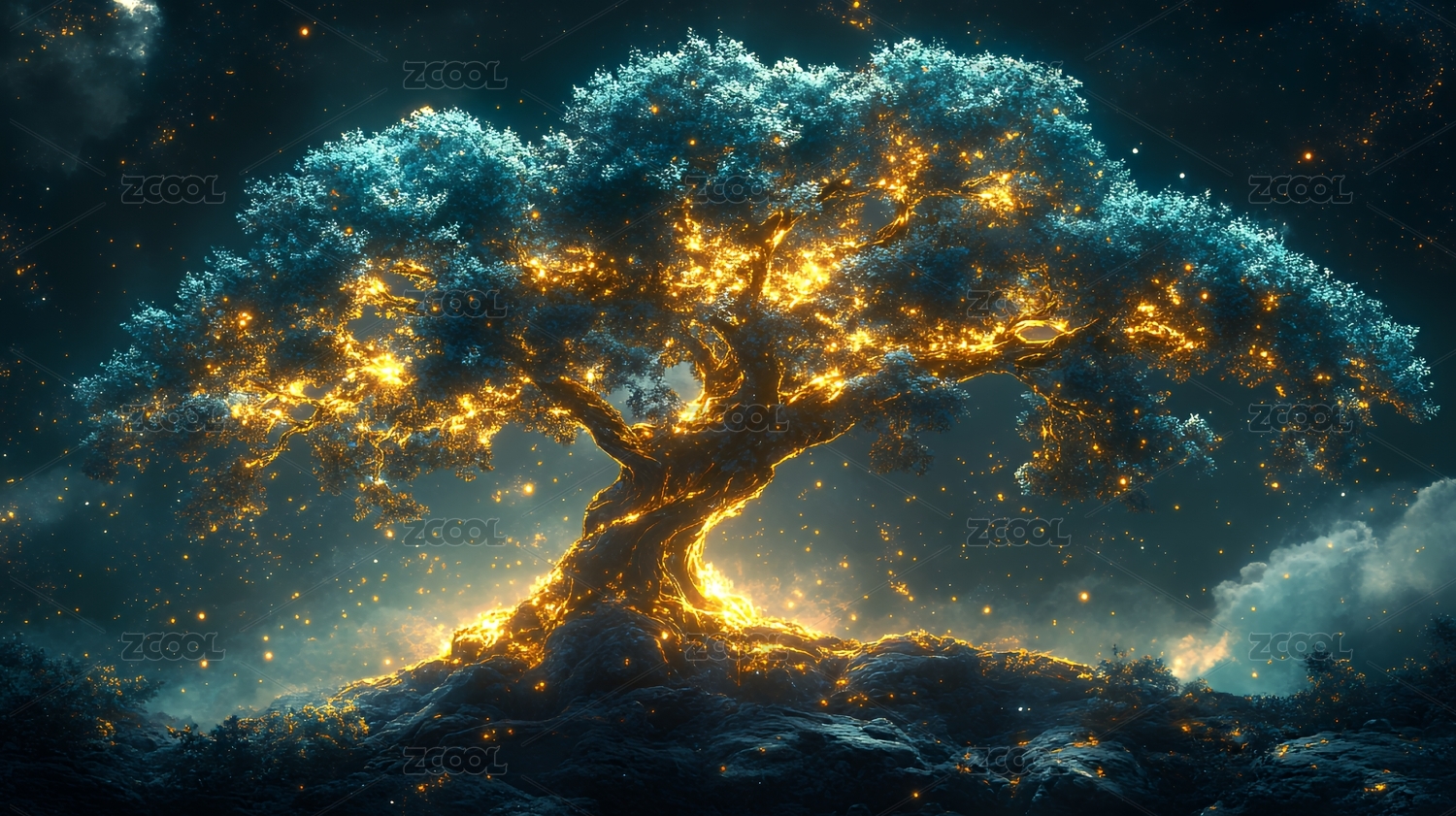 科技树,蓝光,闪烁,树根,树冠,线条,粒子,星空,背景,未来