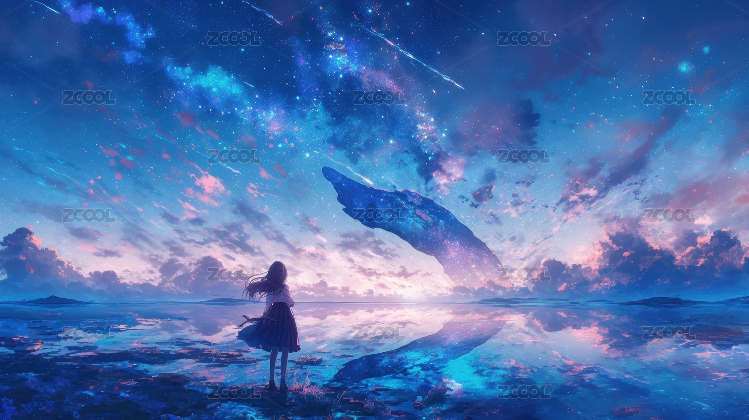 蓝色夜空中的巨大鲸鱼在遨游梦幻场景
