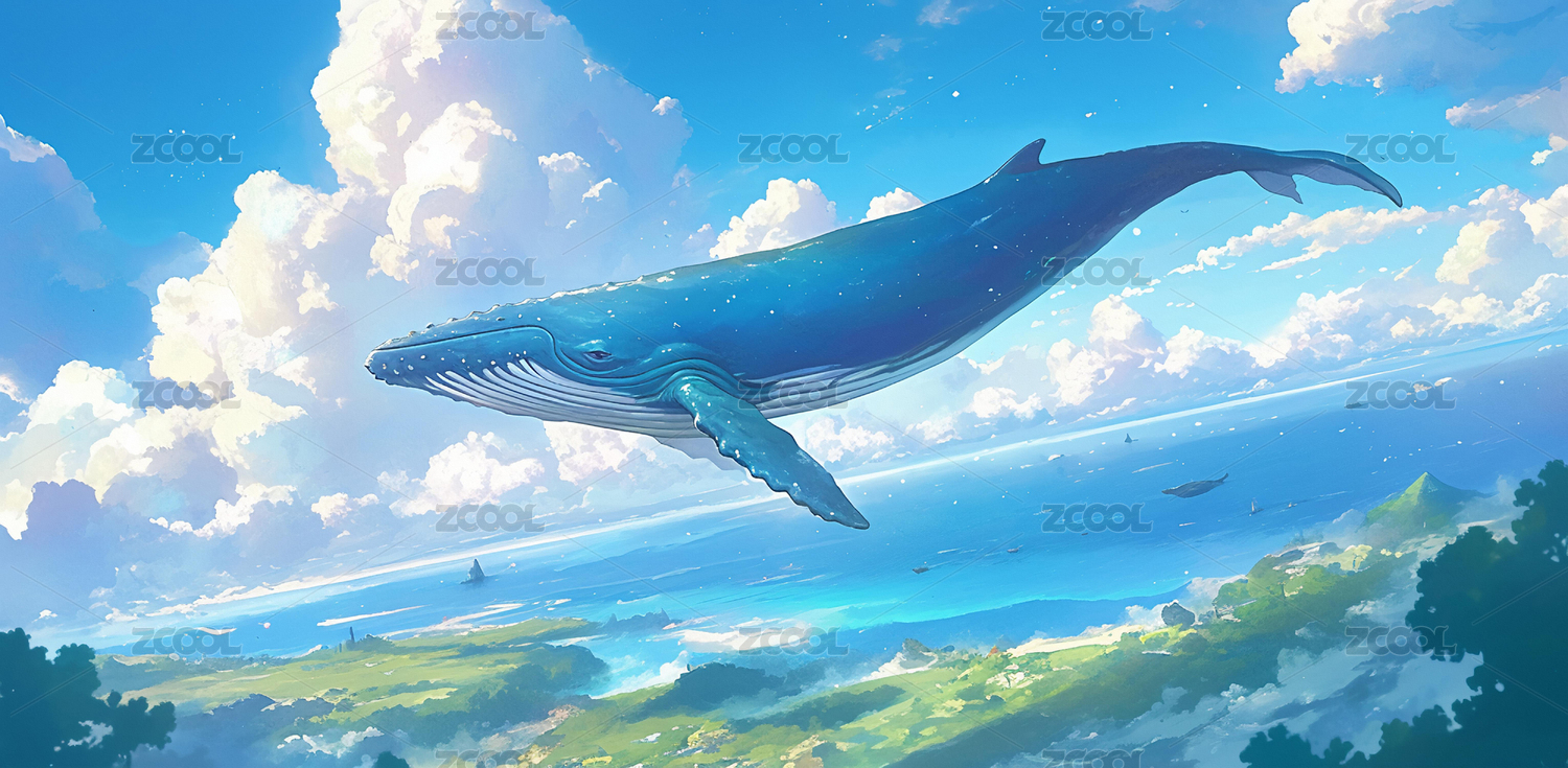 一只巨大的白鲸在深蓝到浅蓝的天空背景