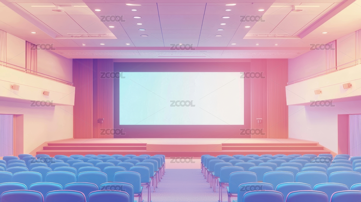 红色主题的剧场空间,舞台上有一块空白荧幕