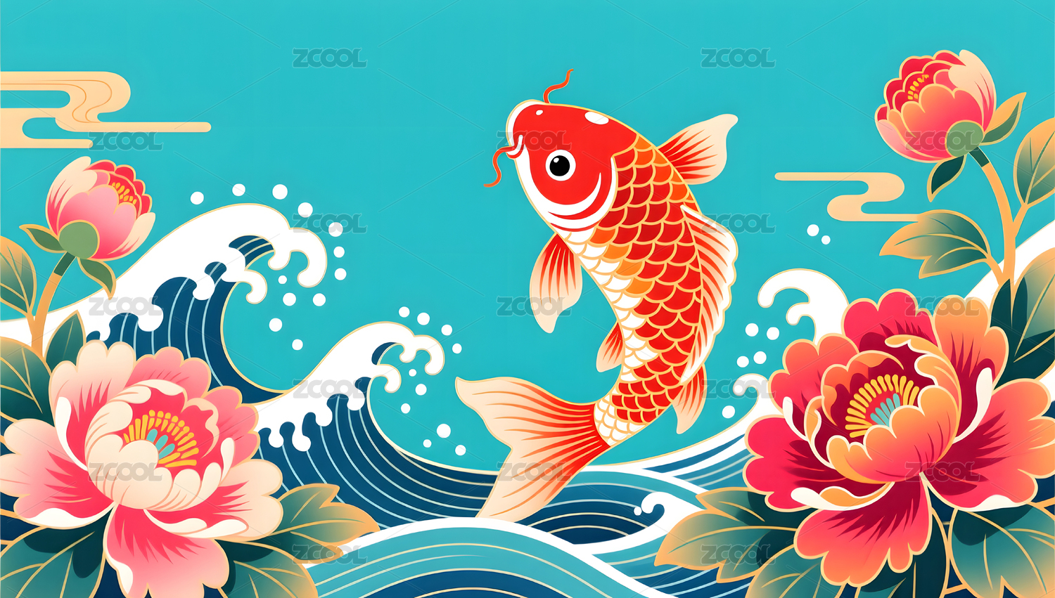 国潮新年牡丹锦鲤红色背景