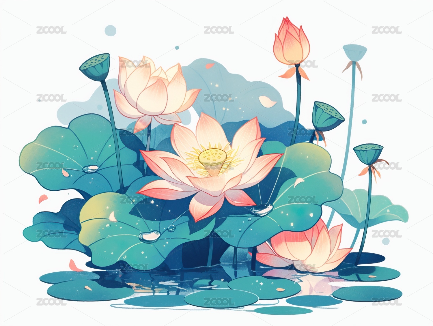 水面上层层叠叠荷花荷叶莲蓬祥云荷花池自然