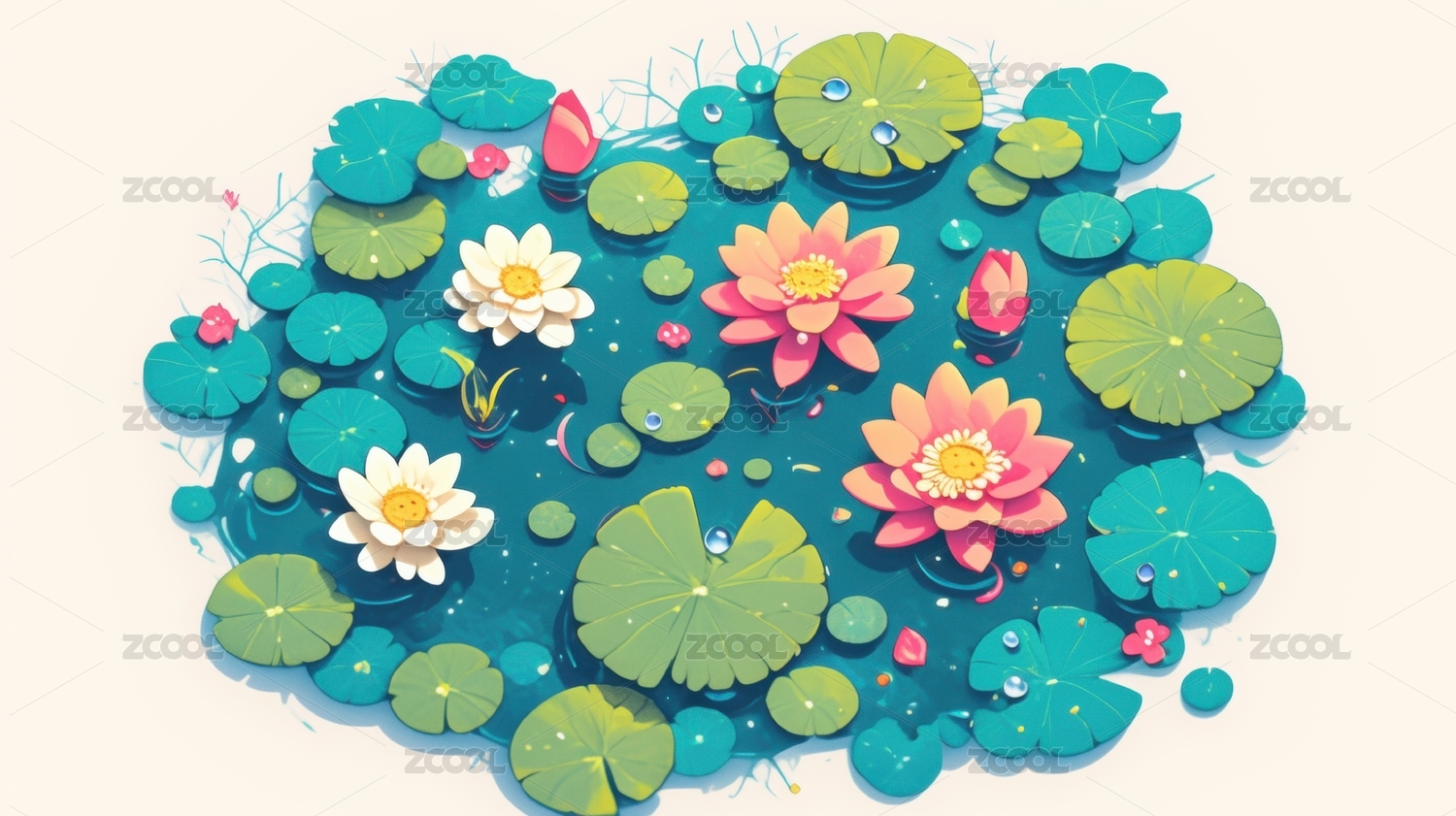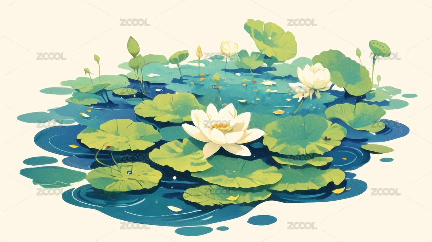 清新优雅的水莲花和绿色荷叶,在透明背景