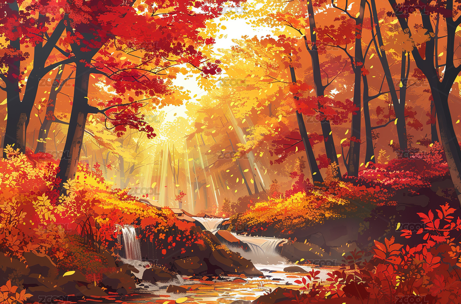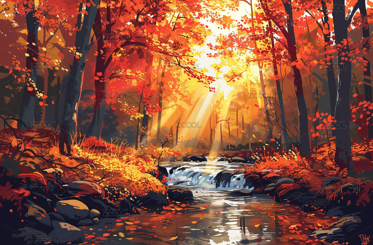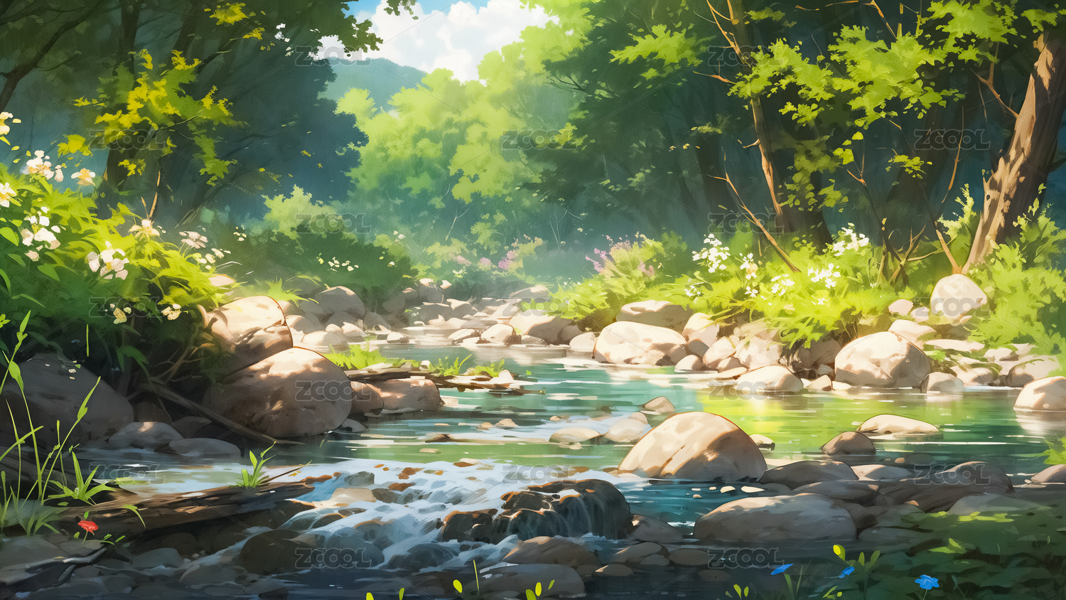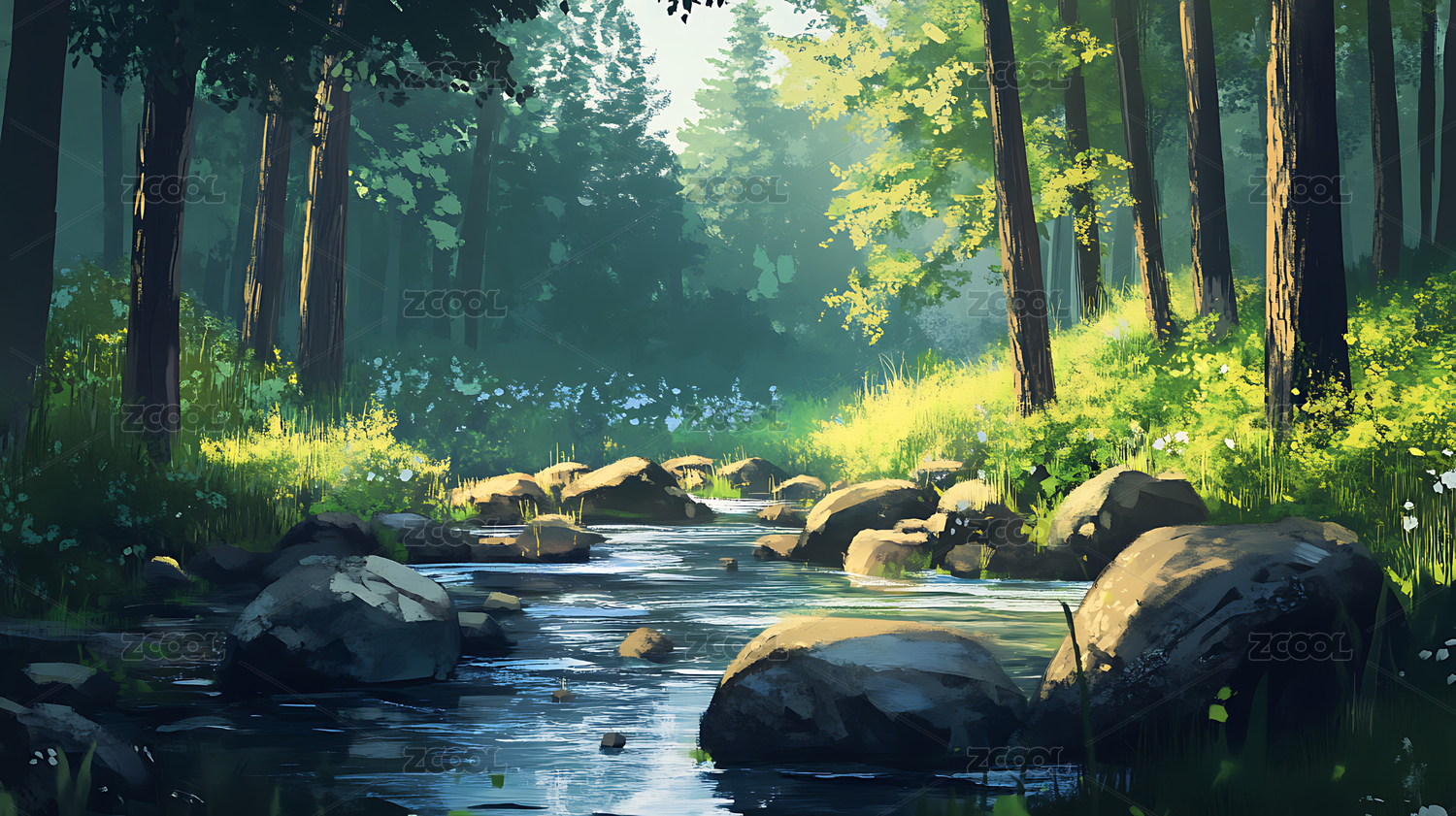 幽静绿色茂密森林中的清澈小溪插画绘画