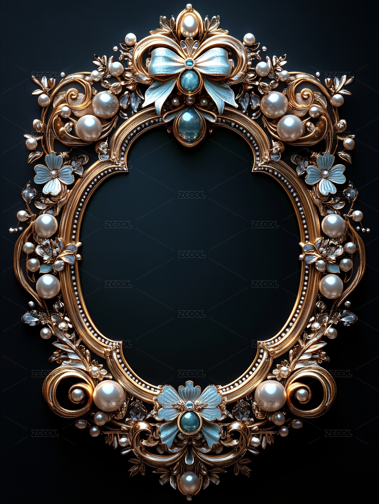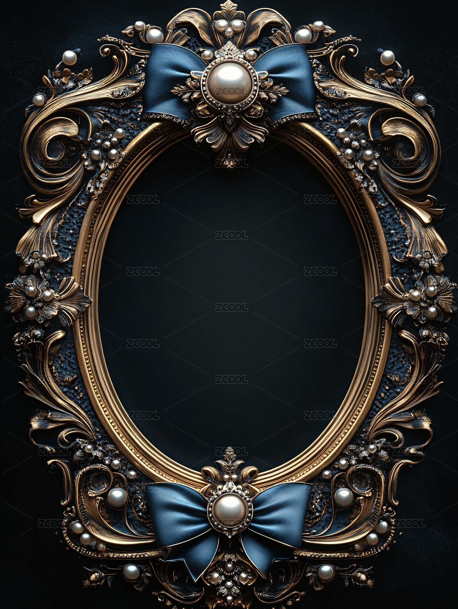 框架,金色,雕花,边框,蓝底,绸缎,质感,蝴蝶结,宝石,珍珠