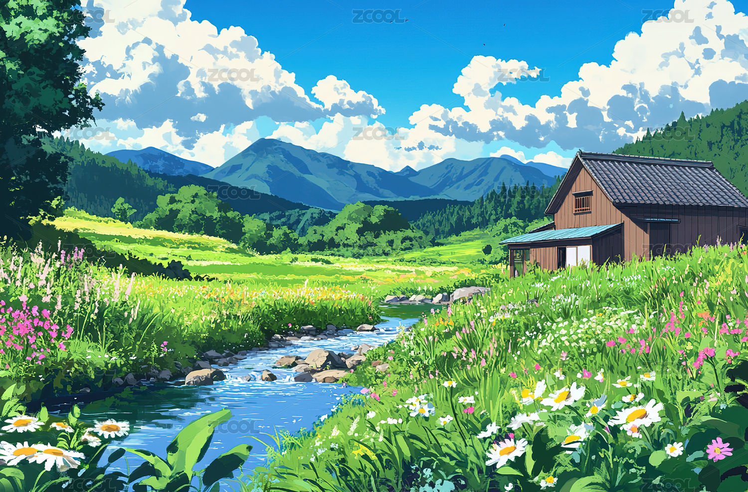 宫崎骏风格漫画乡村风景图