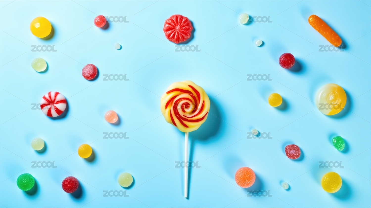 俯拍粉色背景上散落的一堆彩色硬糖素材