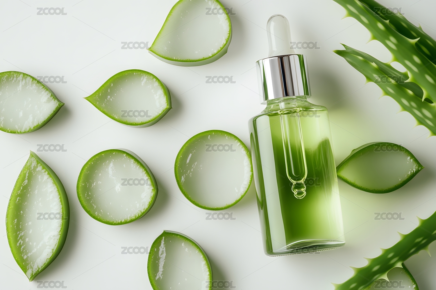 美容,护肤液,芦荟叶,柠檬片,黄瓜片,薄荷叶,罗勒叶,水滴,绿色,清新