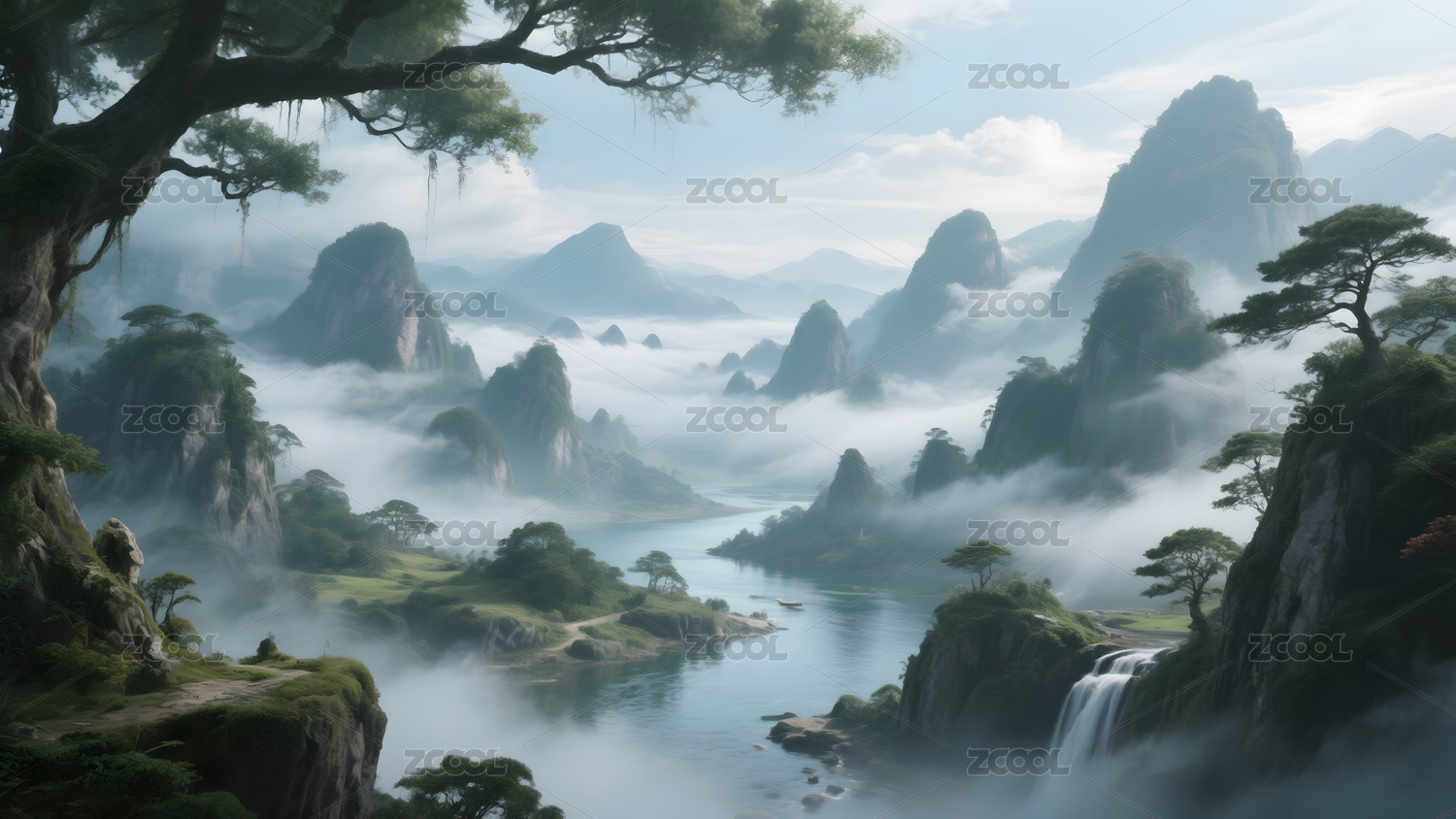 青峰,怪石,云海,仙境,水墨画,山峰,树木,意境,宁静,祥和
