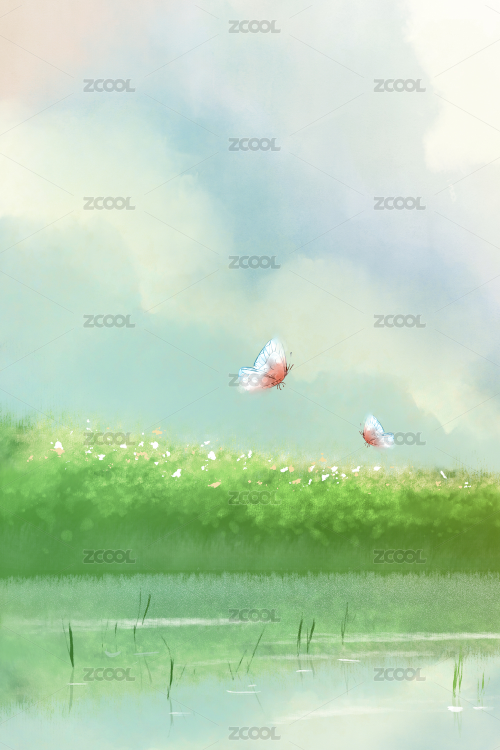 清新春天户外湖畔风景手绘插画