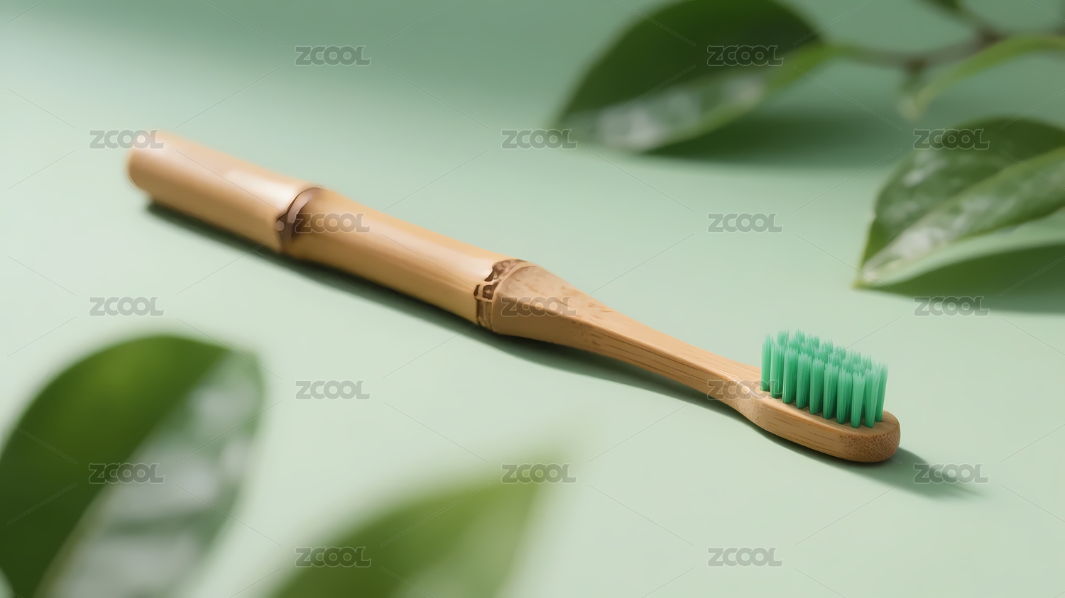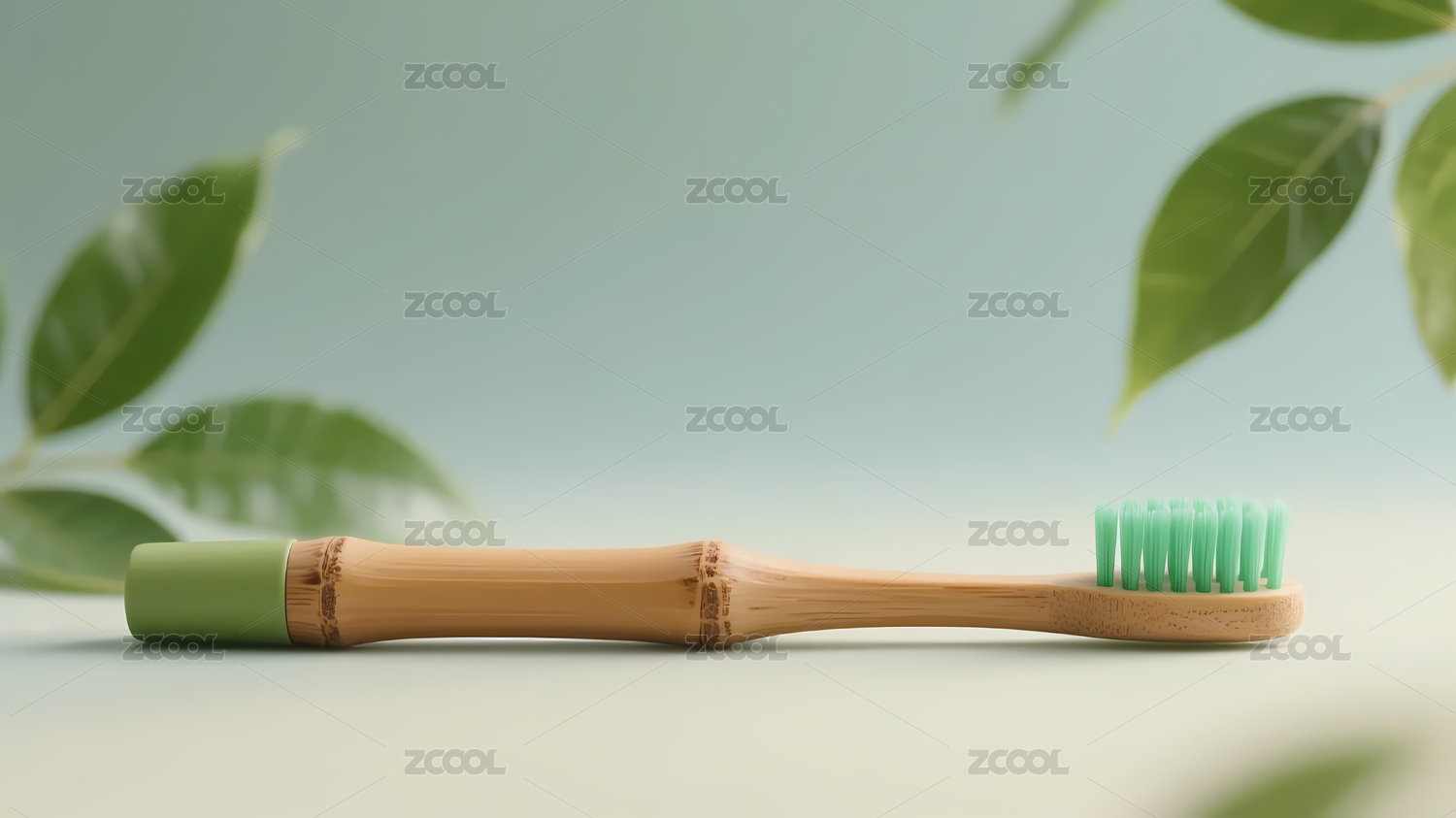 淡绿渐变竹制牙刷绿叶装饰