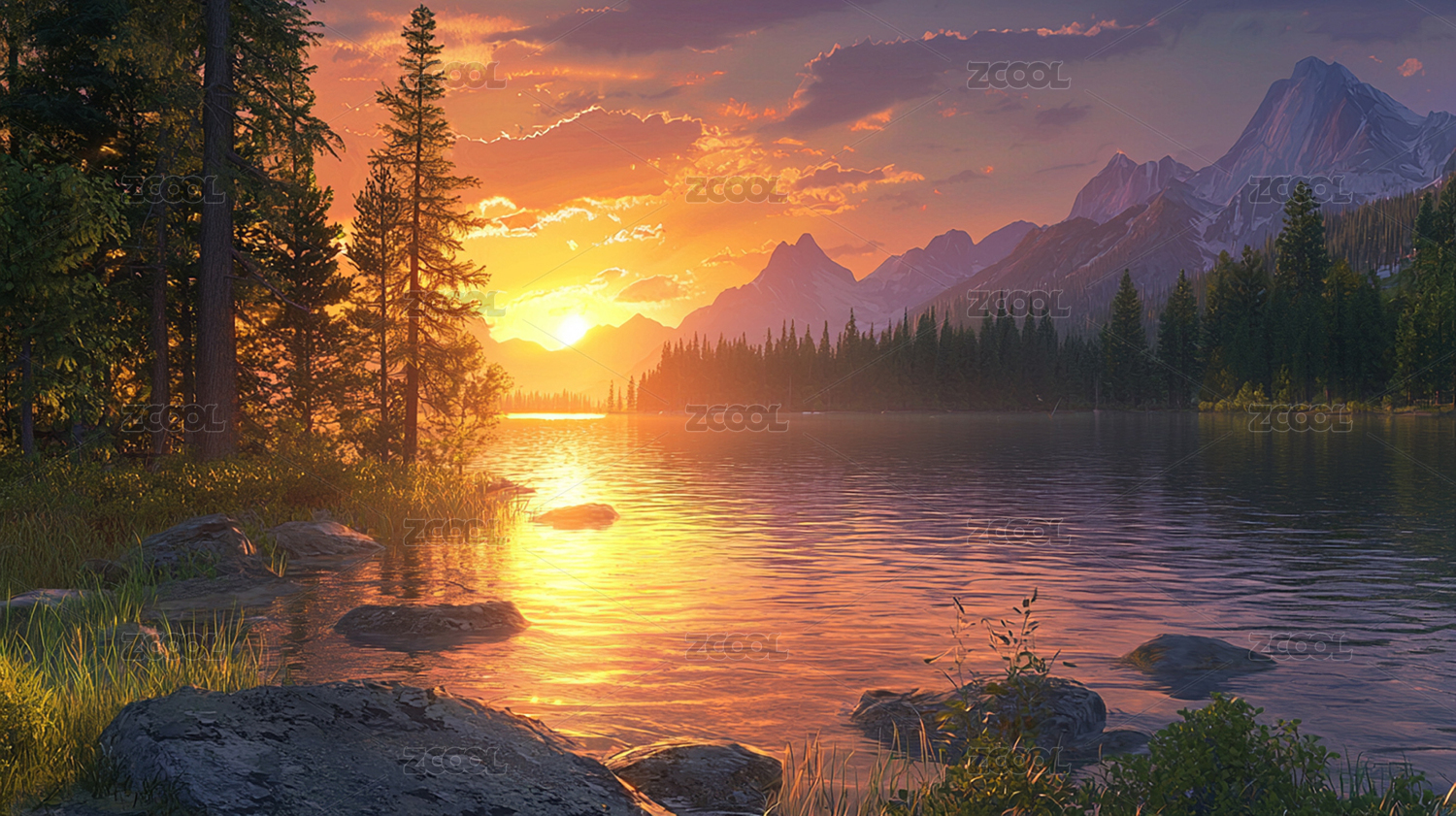 山脉, 自然,日落, 湖泊, 平静, 宁静, 风景, 美景, 云彩, 植物