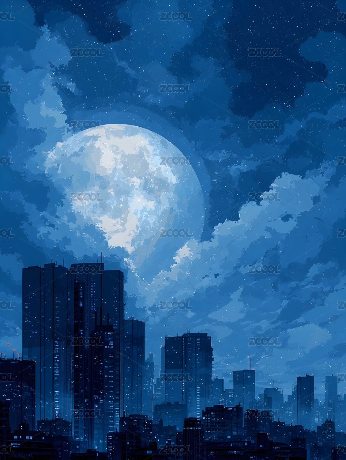 晴朗的夜晚有河流穿过的现代城市建筑油画