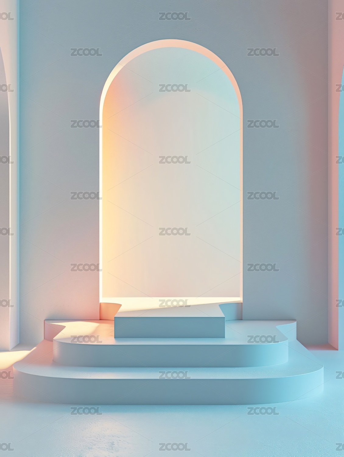 白色阶梯平台与拱形窗的光影场景