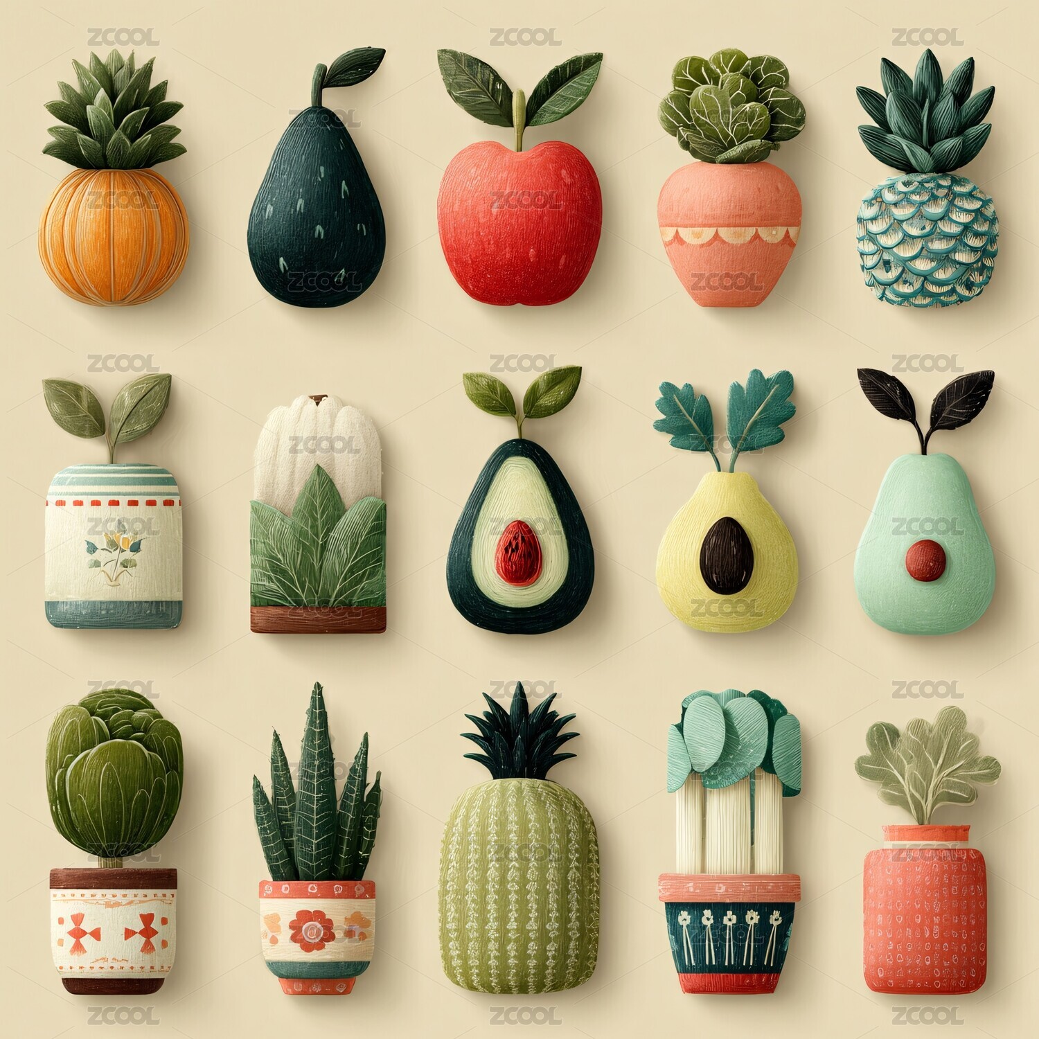 可爱插画风盆栽与水果集合