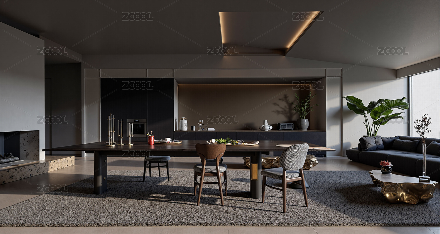 餐厅,餐桌,椅子,吊灯,装饰画,黑色,墙壁,现代,简约