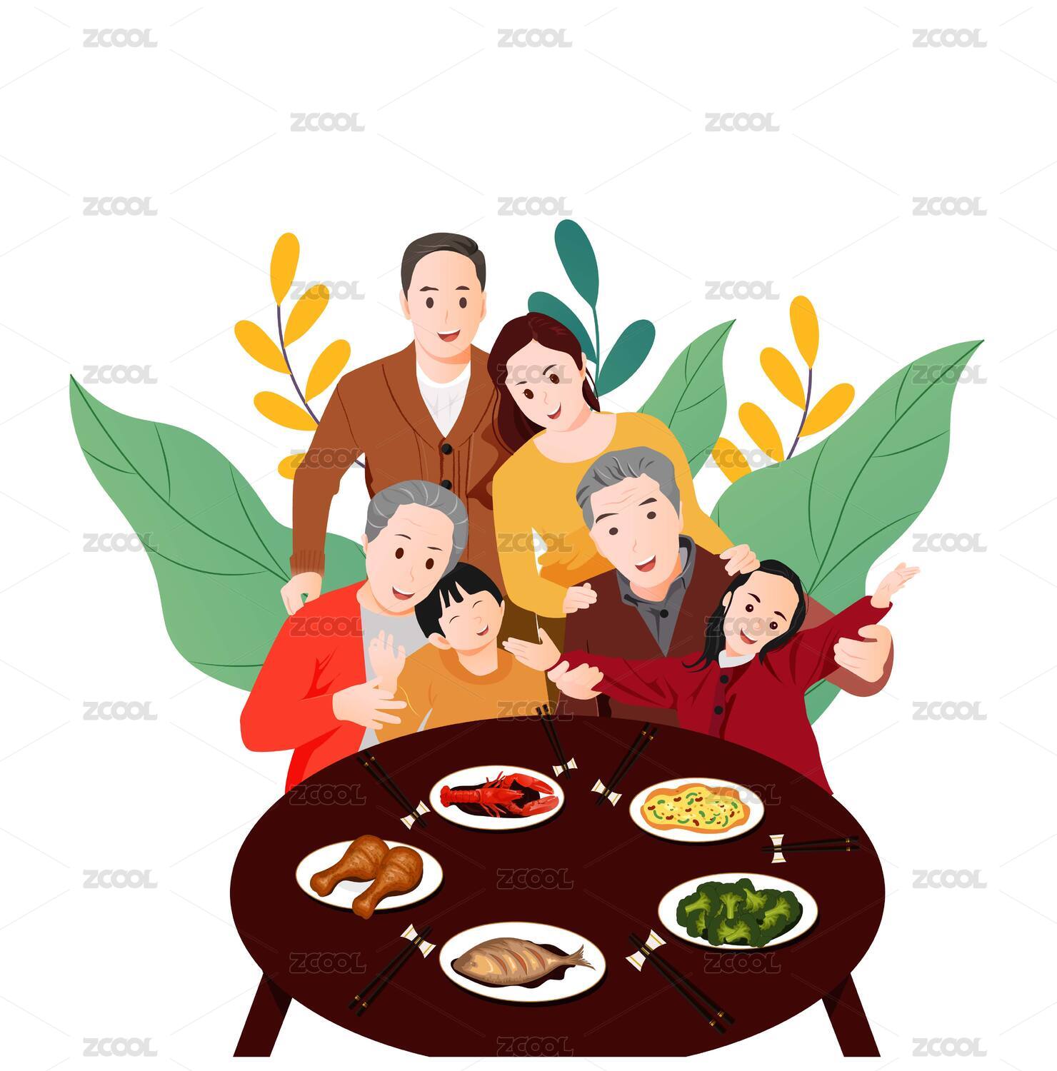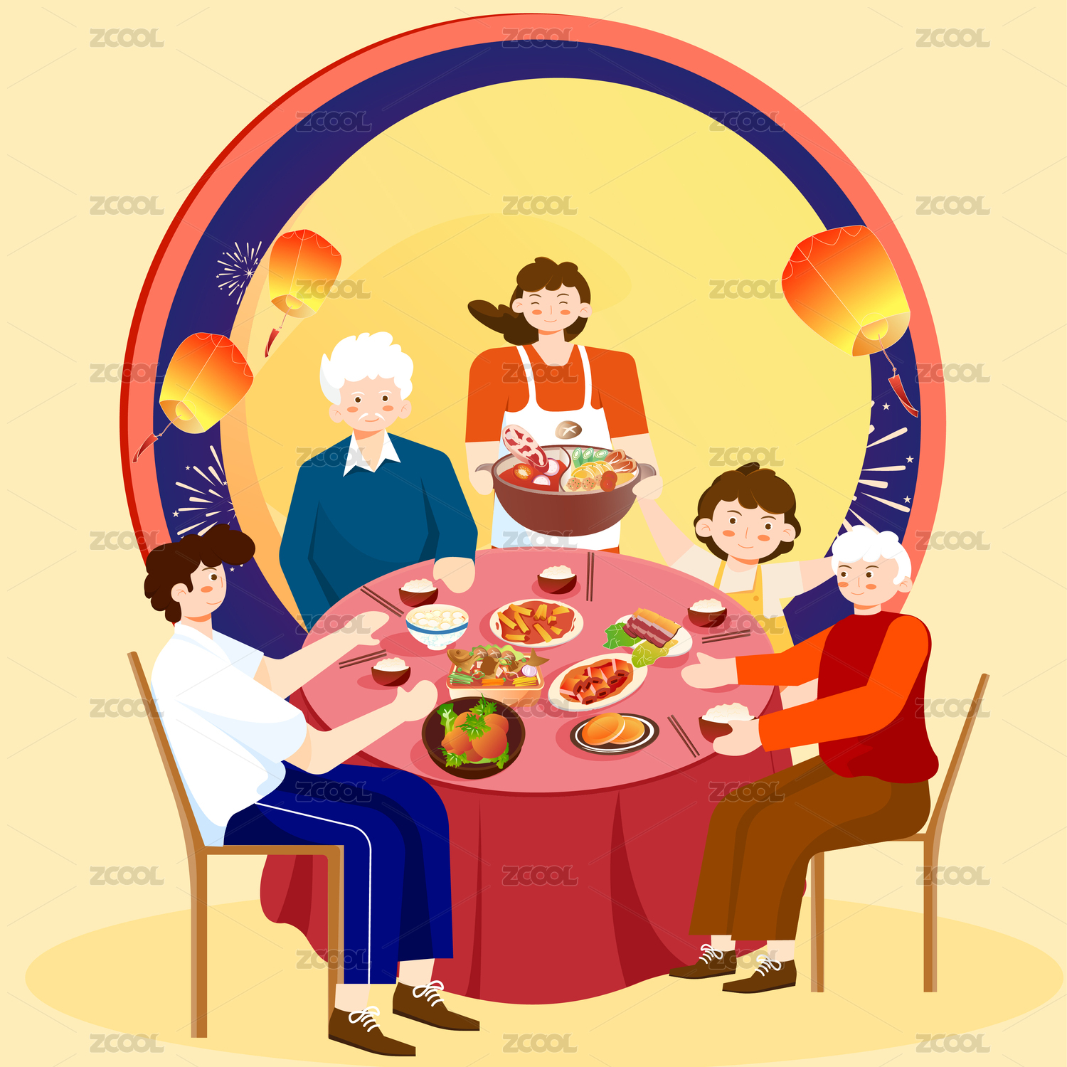卡通手绘一家人吃年夜饭团圆饭喜庆过年插画