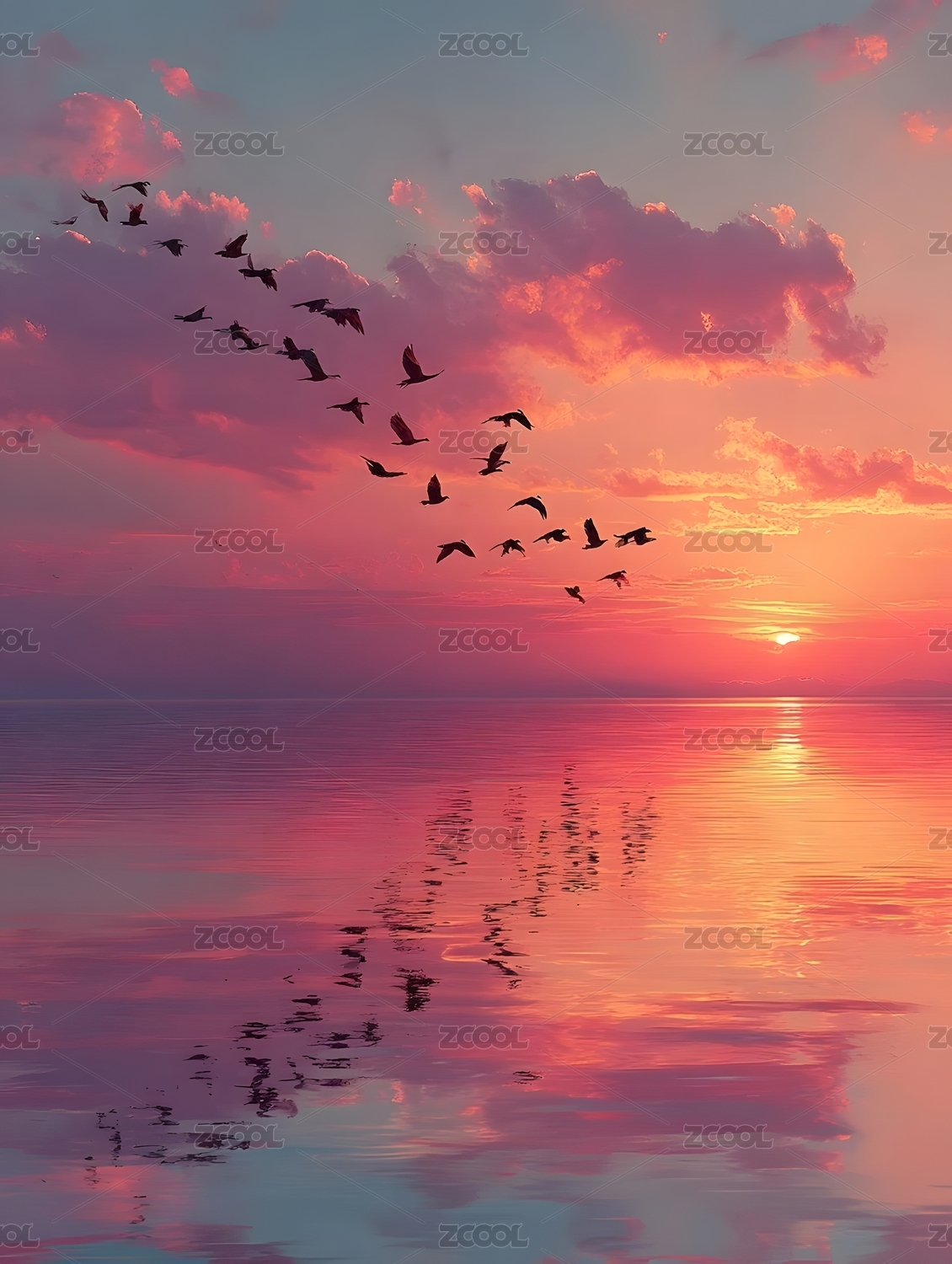 水彩画,海边,日落,飞鸟,海浪,天空,自然,色彩,艺术