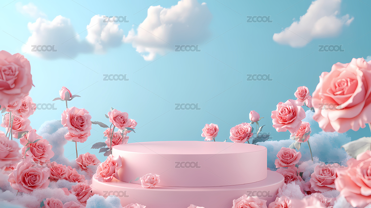 3D天空白云粉色玫瑰花朵圆形产品展台