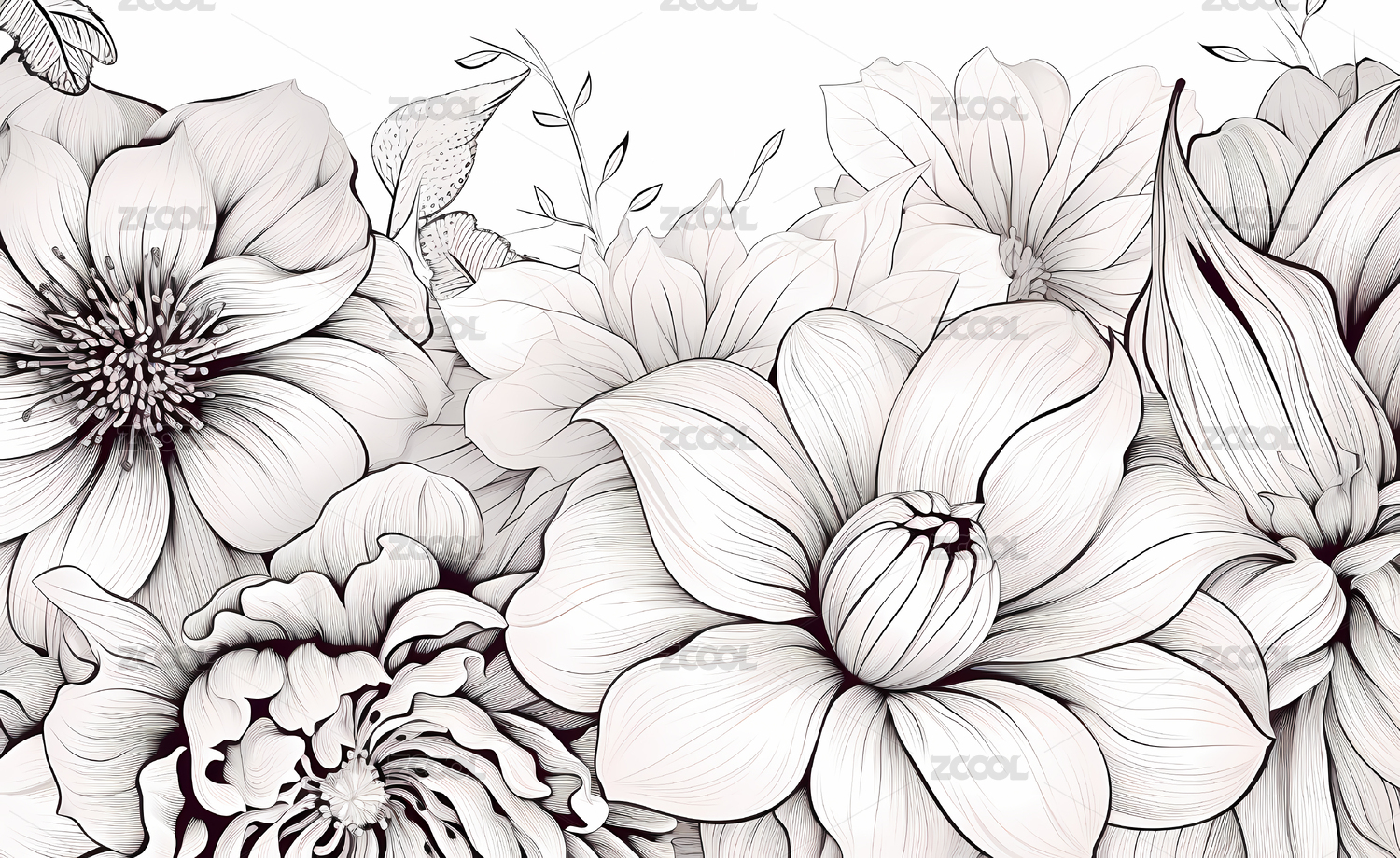 黑白单色版画描边风格玫瑰线稿背景