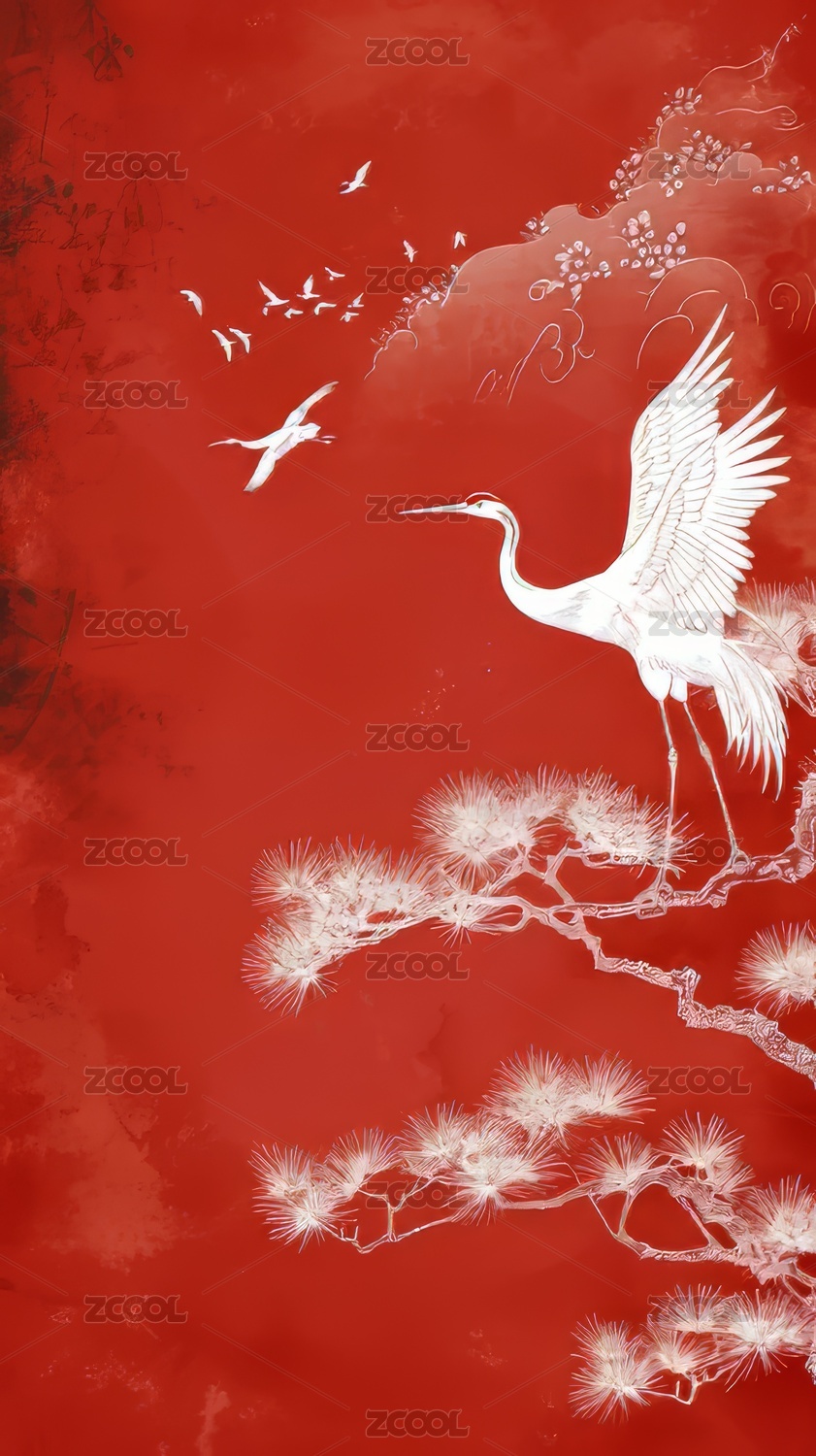 中国文化红色背景仙鹤素材图片