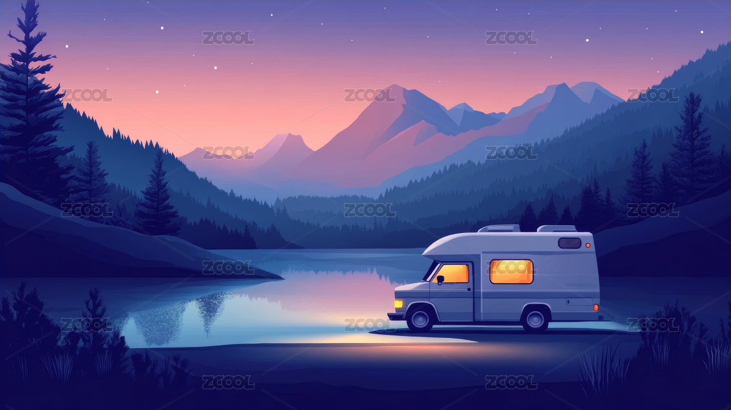 湖光山色中的房车露营插画