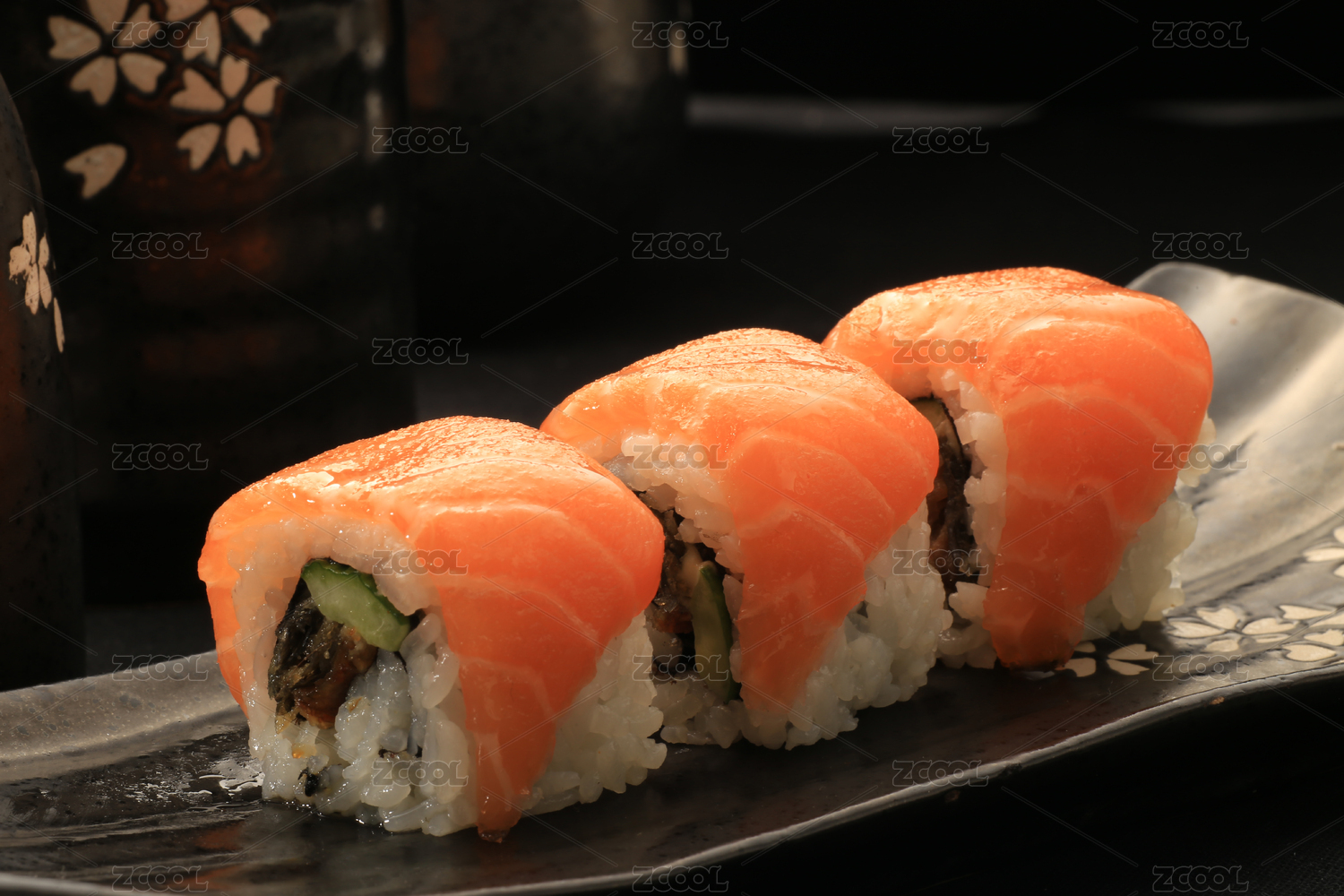 平拍黑色陶盘上的三个三文鱼寿司卷