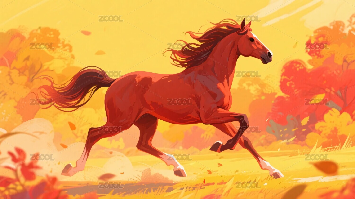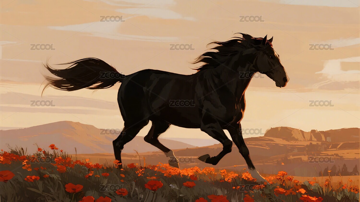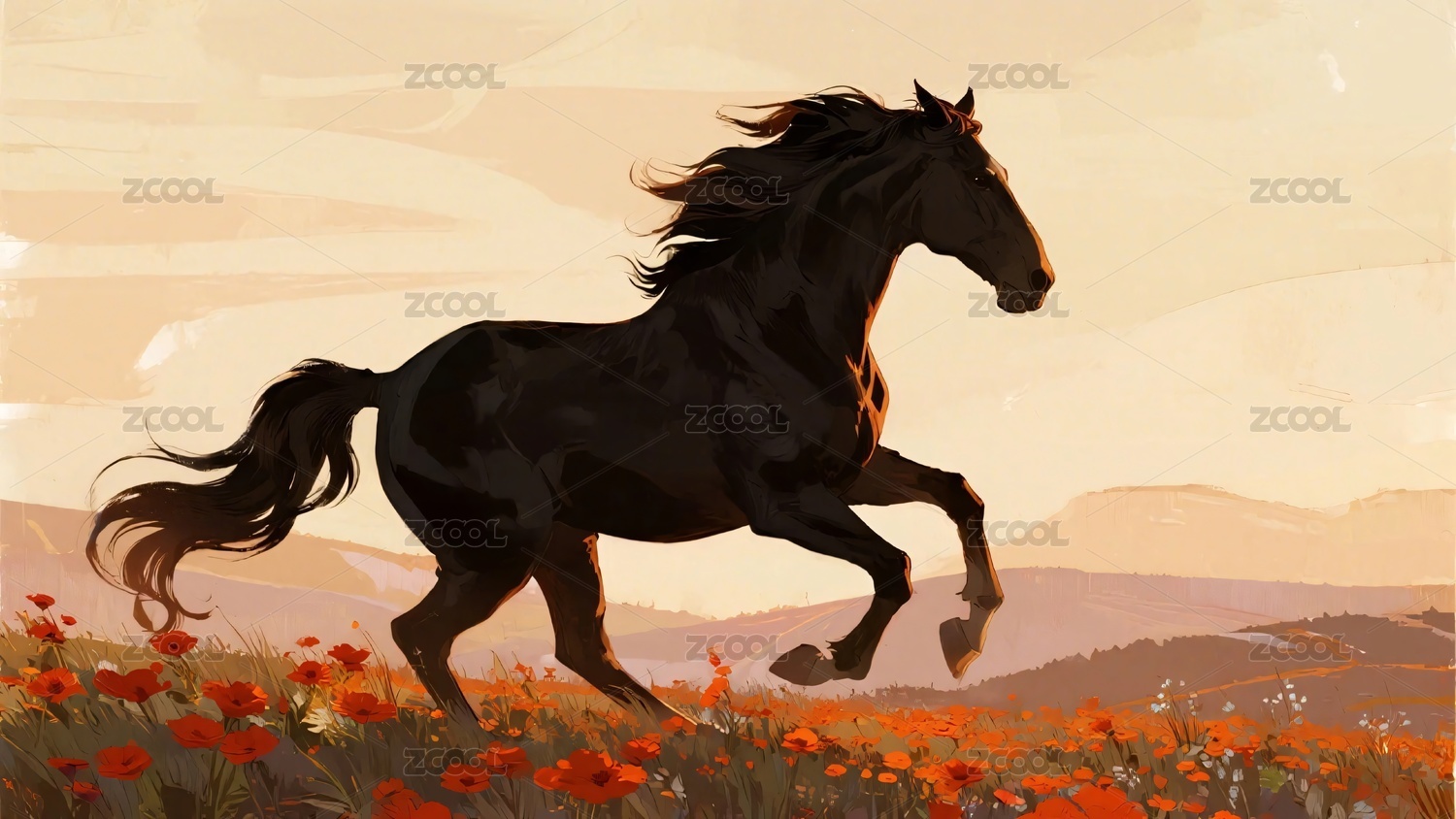 黑马,奔跑,草原,太阳,飞鸟,插画,动态