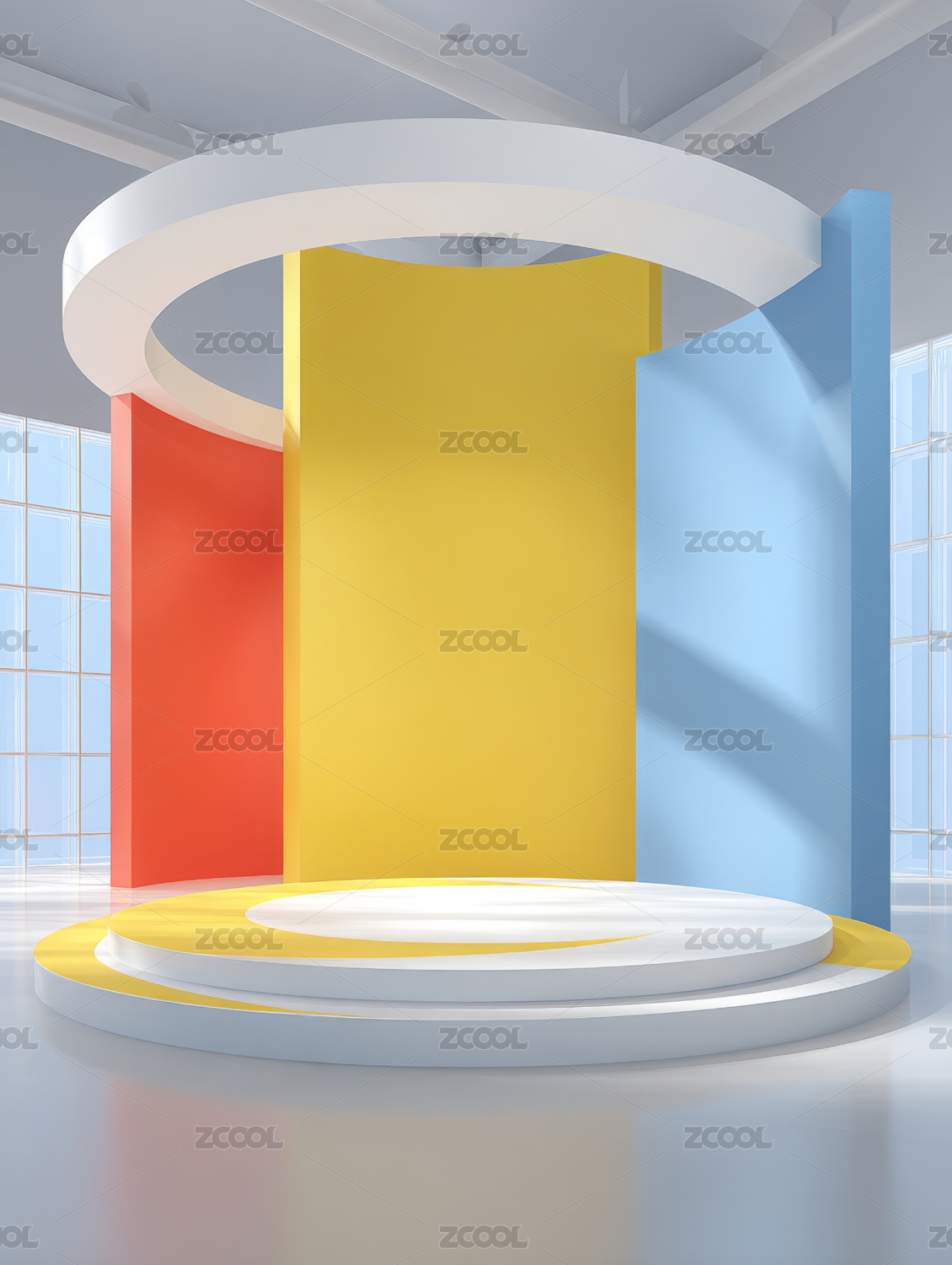 黄色,蓝色,圆形,平台,现代,艺术,展示,室内,设计