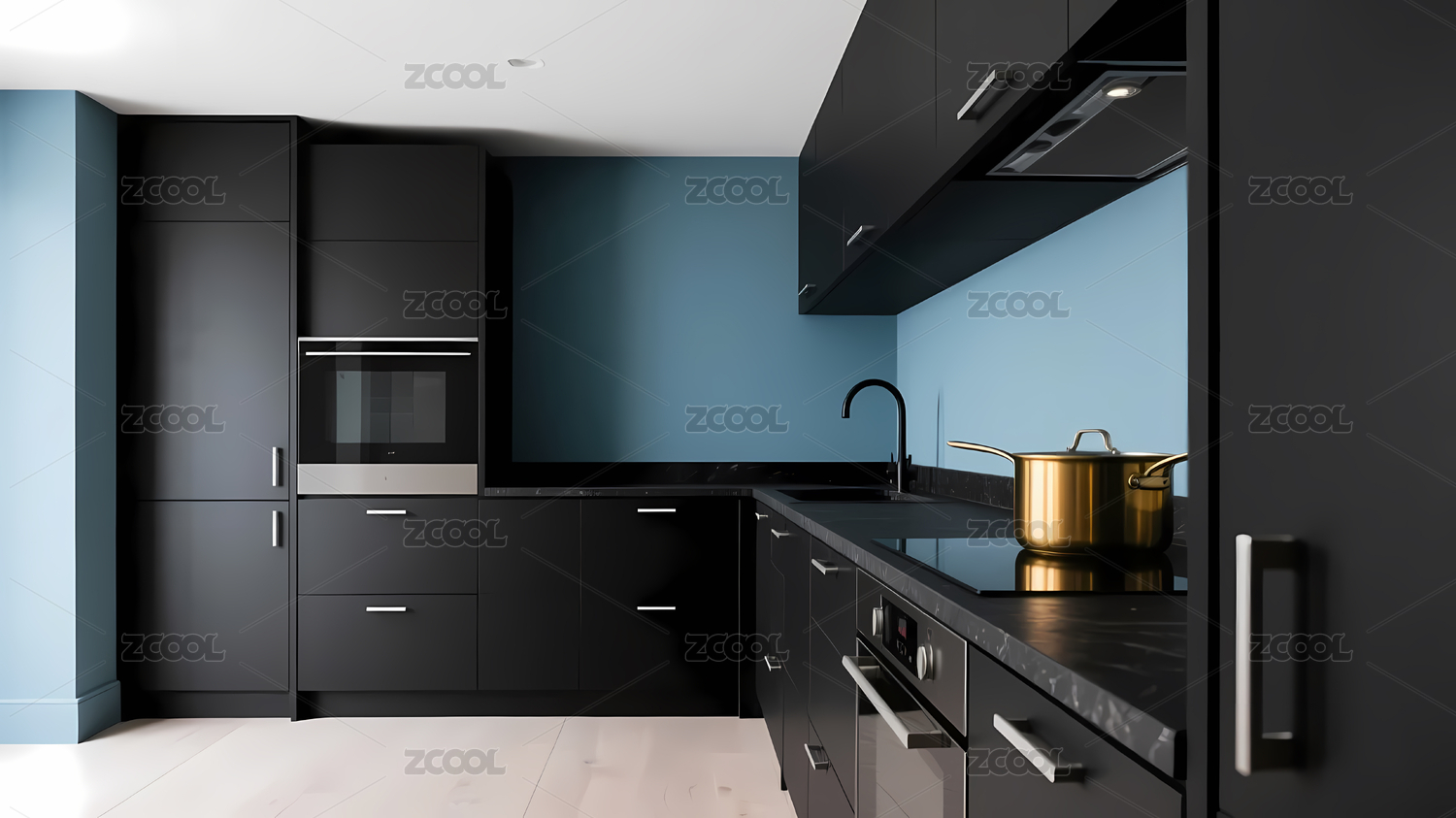 厨房,深蓝色,黄色,橱柜,吊灯,植物,现代,室内,设计