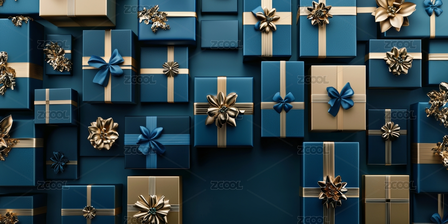 深蓝色礼品盒金色丝带精美排列