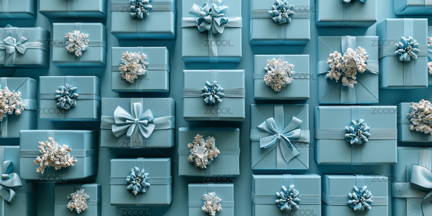 浅蓝色礼物搭配白色装饰的节日场景