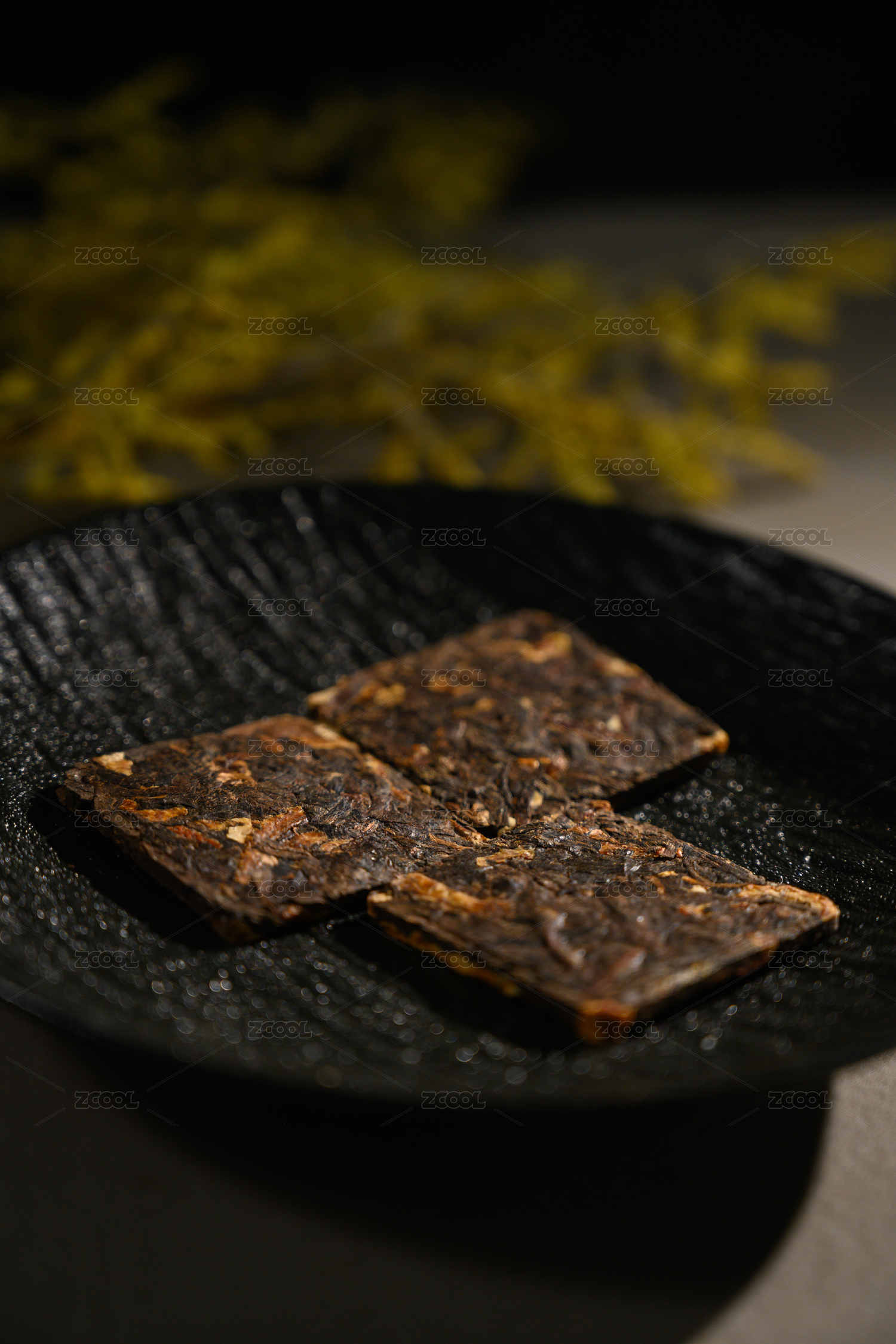 桌面上的盘子里的干爽香气四溢的陈皮普洱