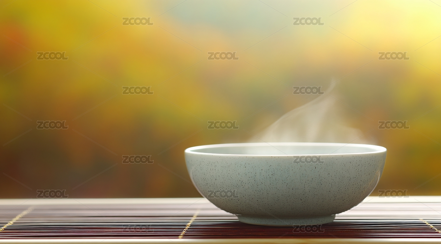 浅色碗旁枝叶碗中热气袅袅