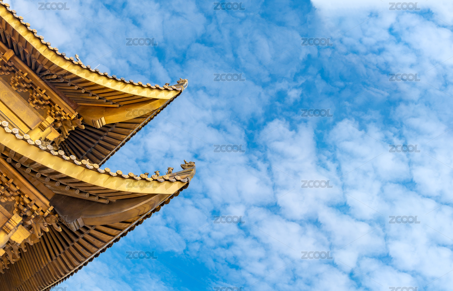 金色庙宇的飞檐斗拱,中国四川省峨眉山金顶
