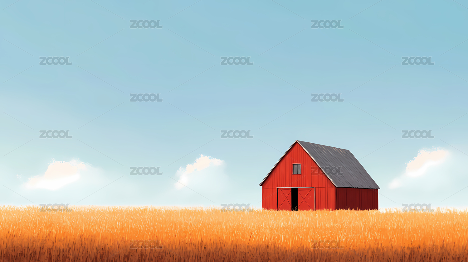 红色,谷仓,麦田,金黄,蓝天,白云,屋顶,棕色,瓦片,木头