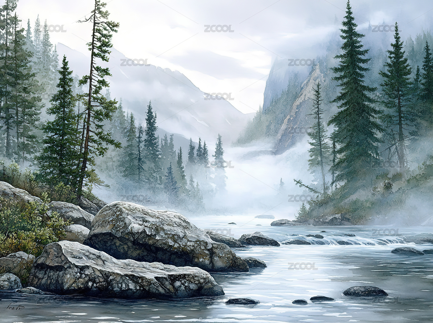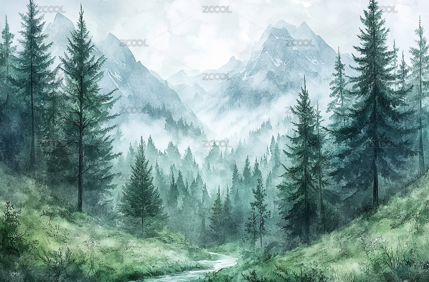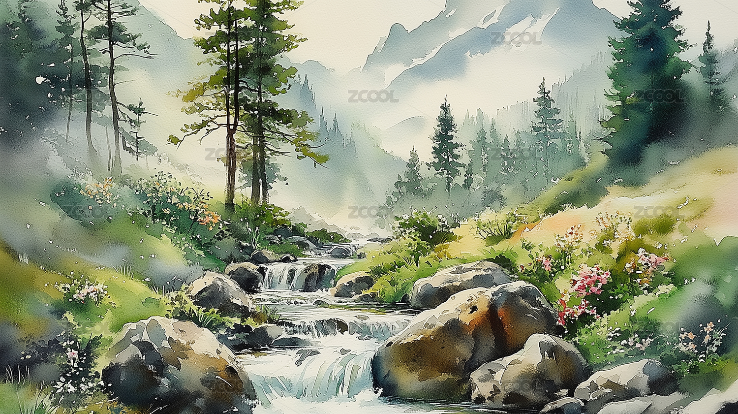 水彩画山涧溪流