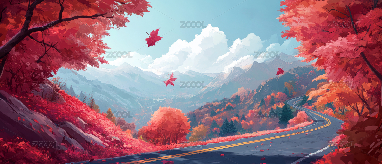 秋景, 公路, 雪山, 远景, 山峰, 落叶, 枫林, 金黄, 道路, 漫长