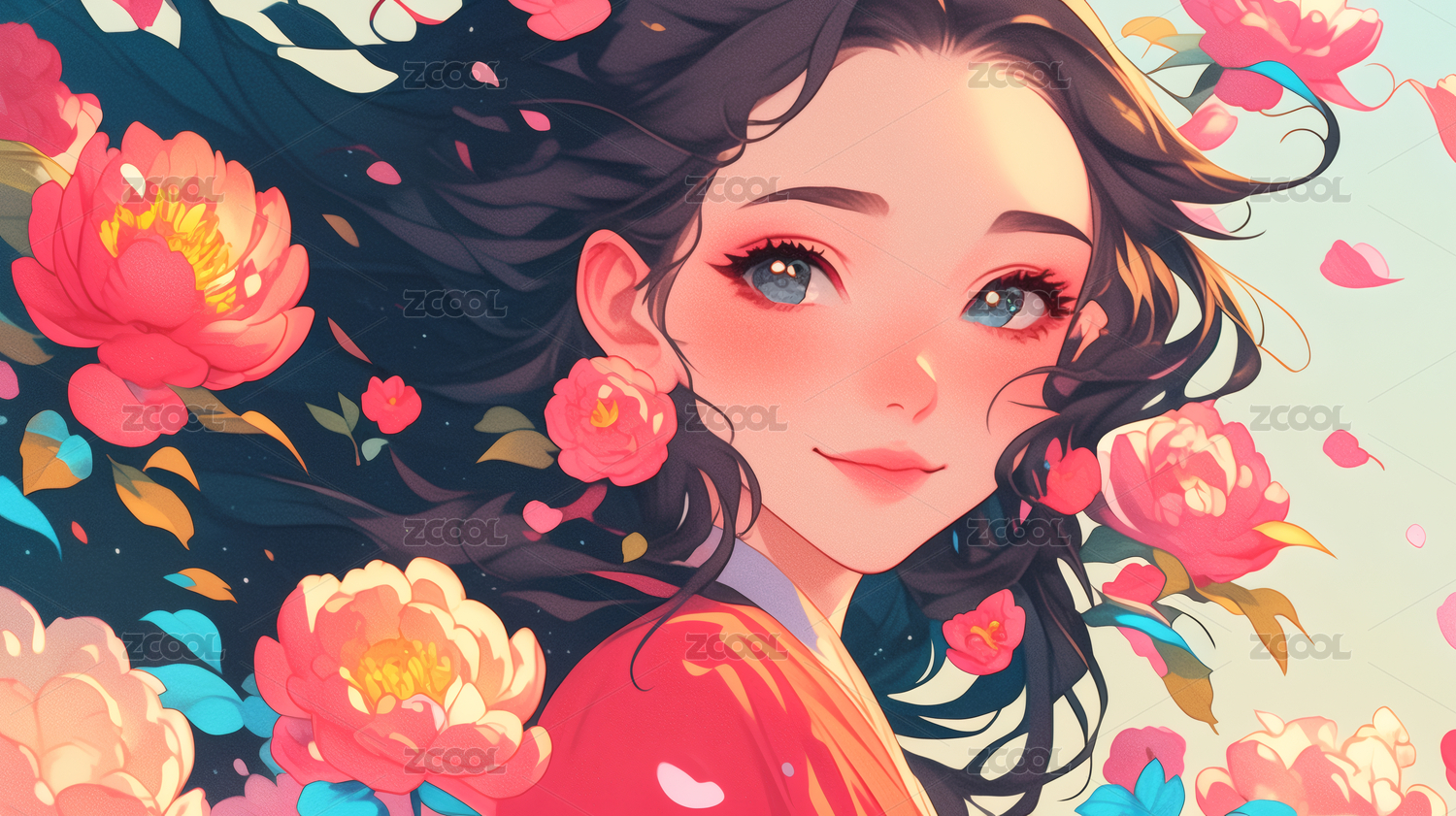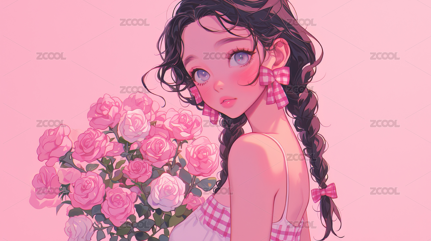 粉色背景下抱着鲜花的动漫少女