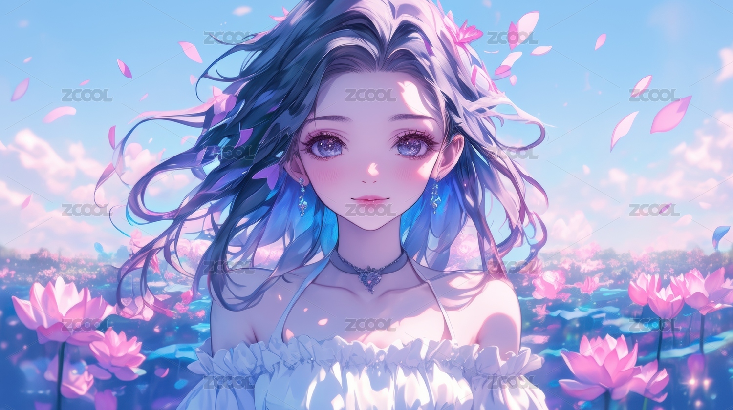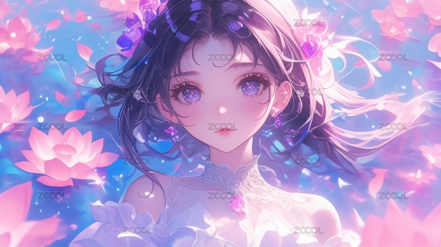 梦幻莲花池中的蓝发少女